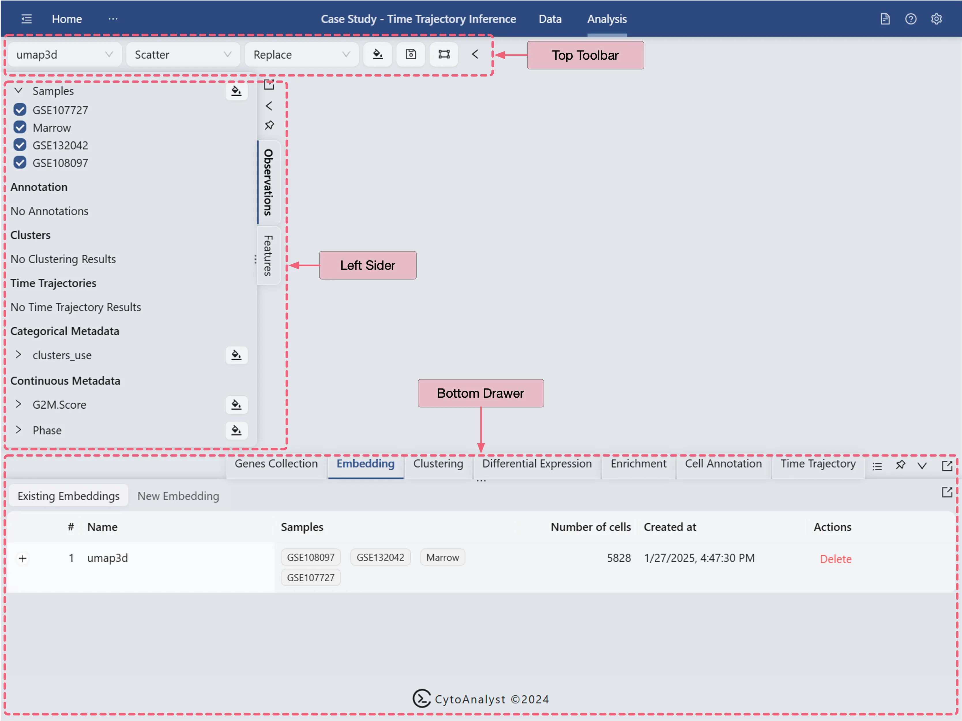 To perform trajectory inference analysis, click the Time Trajectory tab on the Bottom Drawer, and then click the New Time Trajectory button.