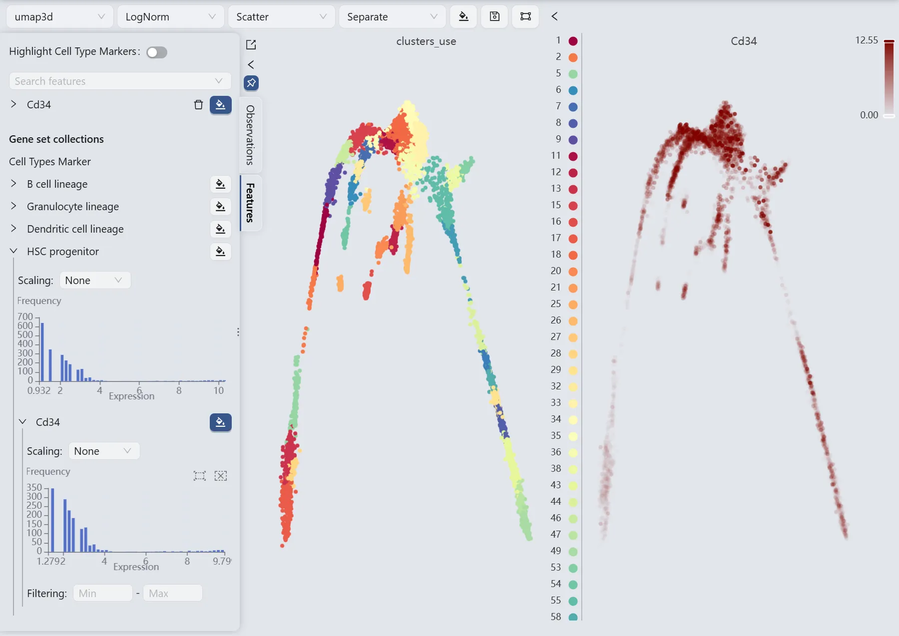 We will observe the expression of the Cd34 gene to manually select the starting and ending points for the Slingshot method parameters.