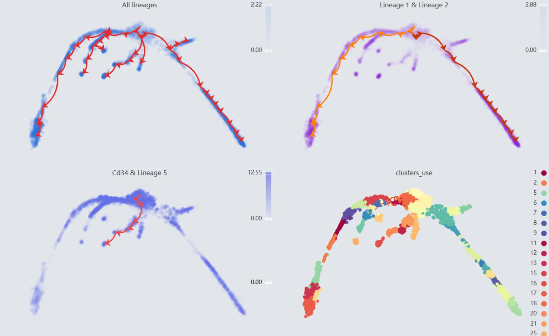 Cd34 & Lineage 5. Illustrates theCd34gene expression overlay with the representative lineageLineage 5.Fourth plot: