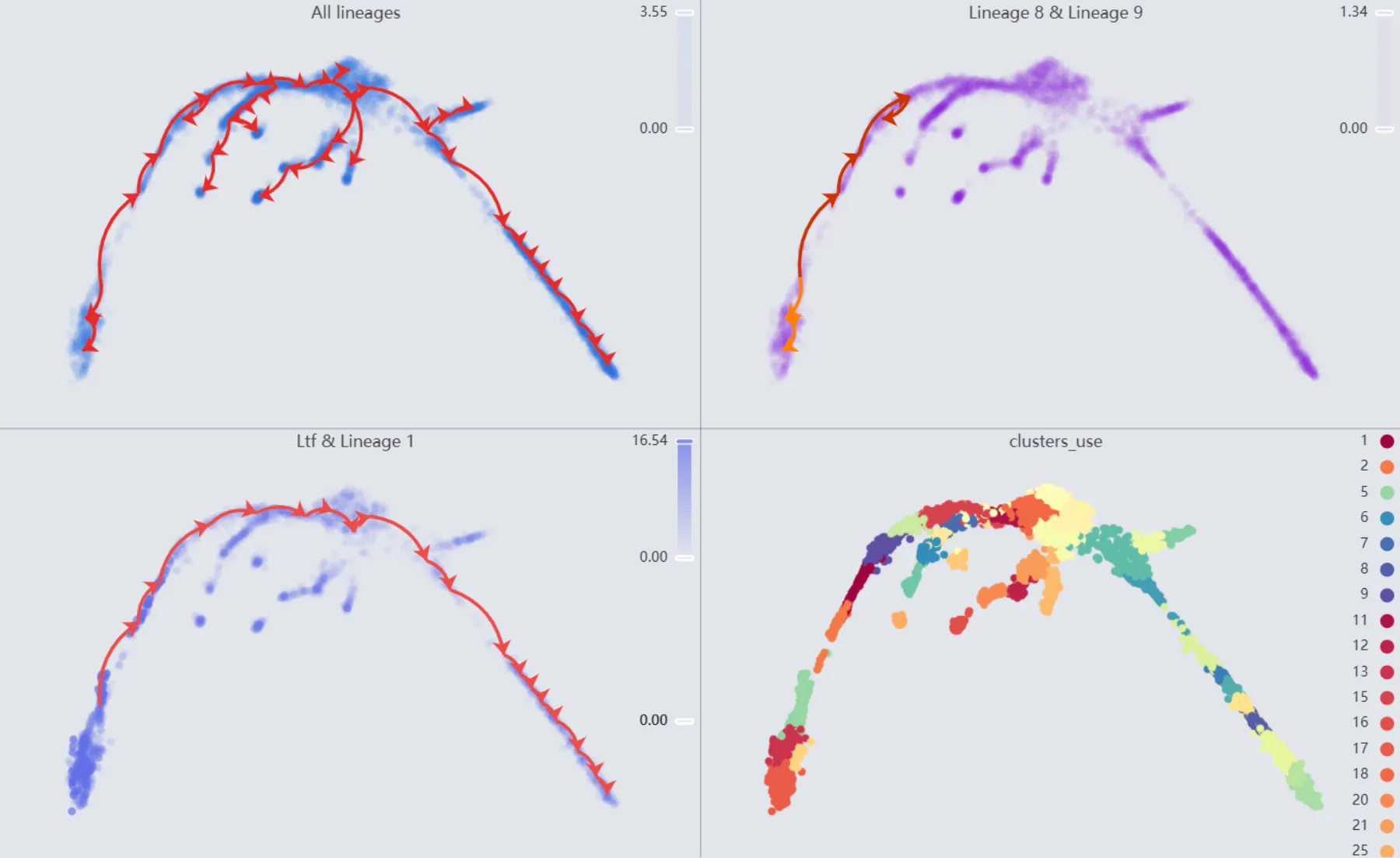 Ltf & Lineage 1. Illustrates theLtfgene expression overlay with the representative lineageLineage 1.Fourth plot: