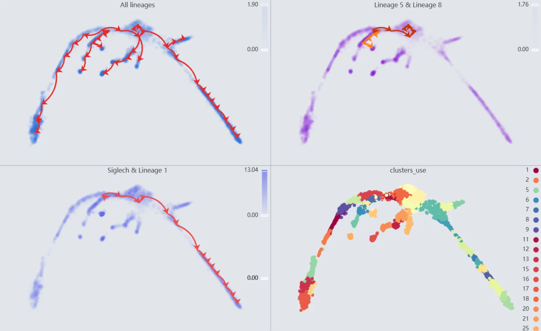 Siglech & Lineage 1. Illustrates theSiglechgene expression overlay with the representative lineageLineage 1.Fourth plot: