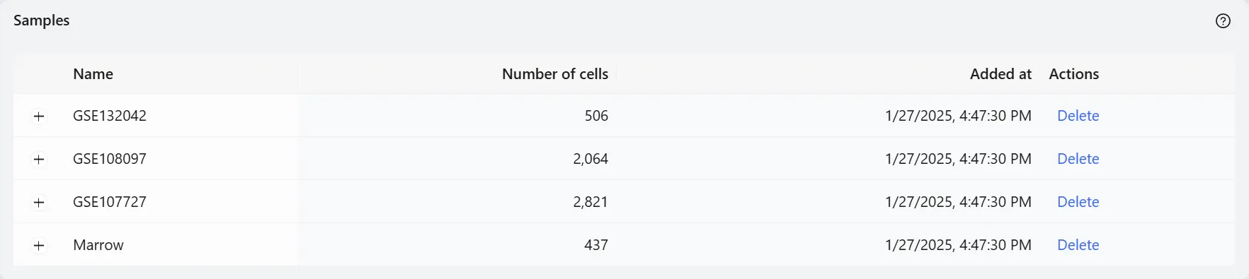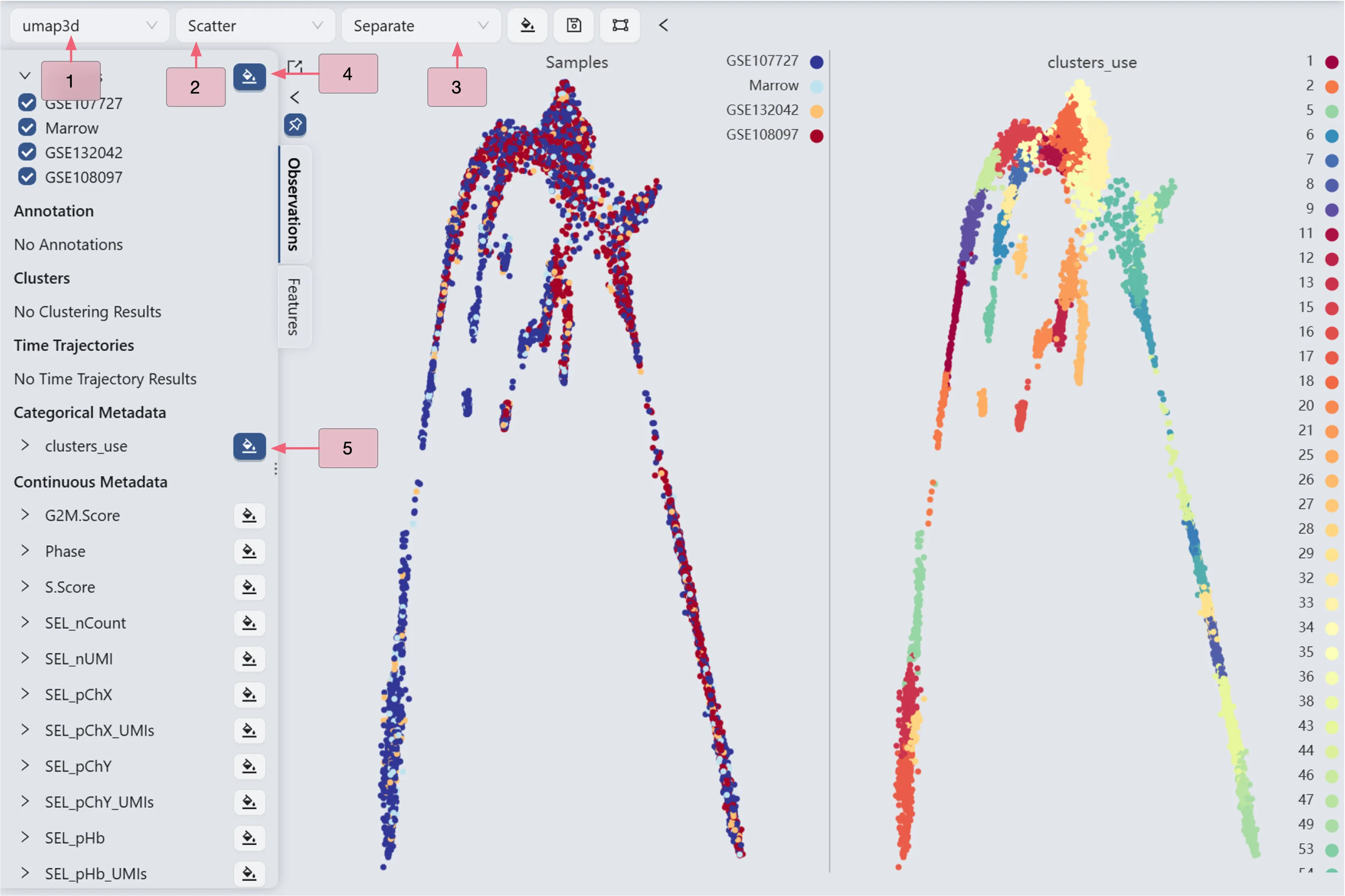 In the label selection panel on the left sidebar, select all samples, including GSE107727, Marrow, GSE132042, and GSE108097. Then, click the