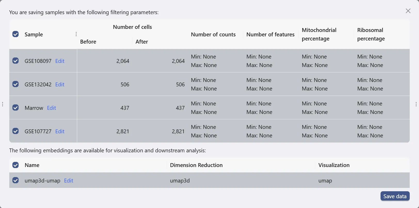 This dialog allows you to choose which samples and embeddings to save. In this case study, we will save all samples and the embedding that we chose to retain in the data uploading process.