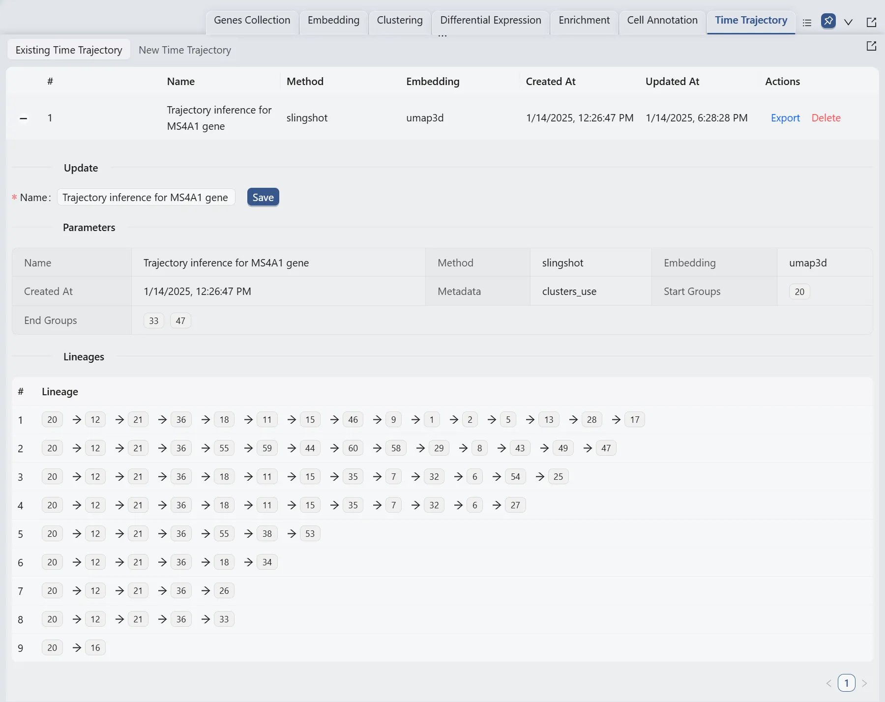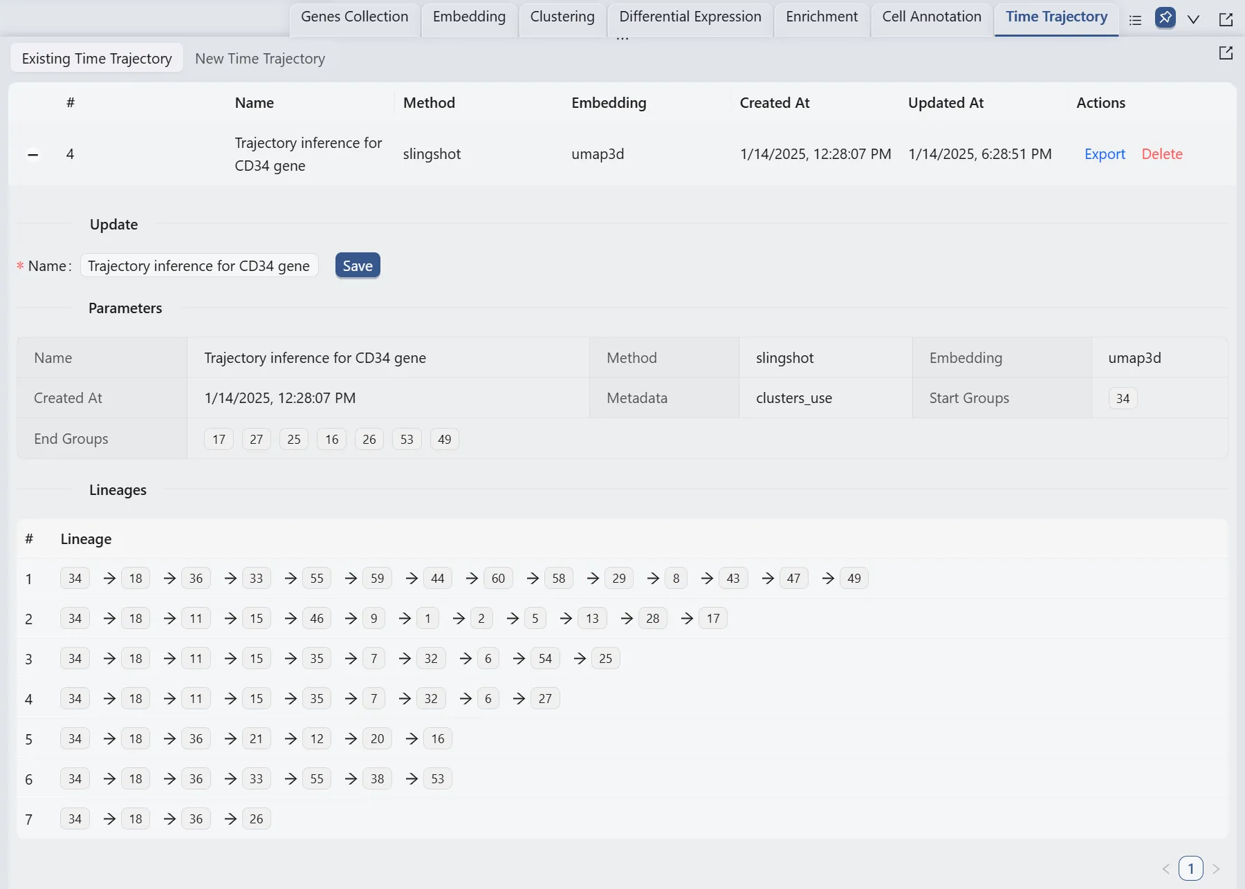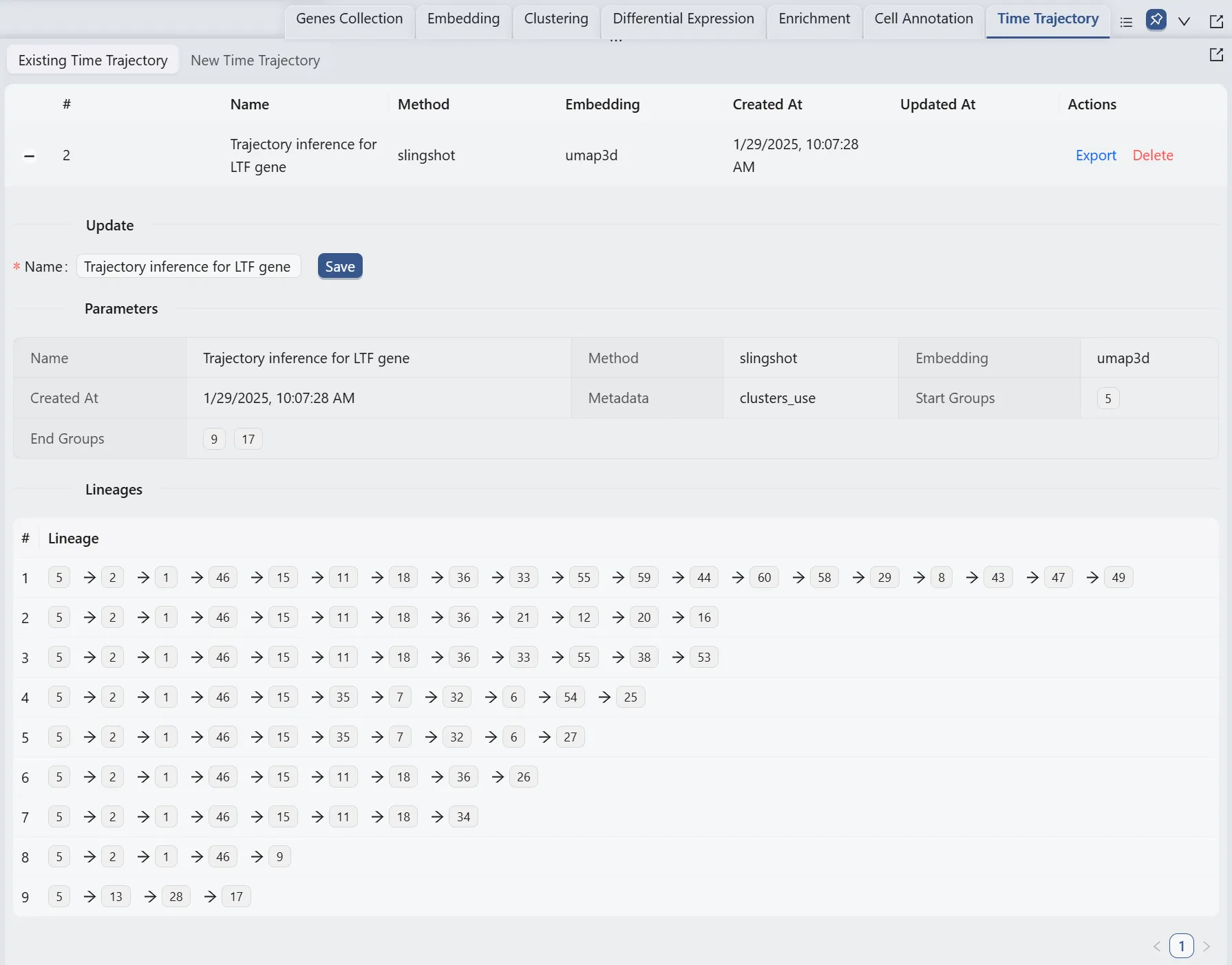 Once the trajectory inference is completed, the results will be added to the Trajectory Inference Table in the Existing Time Trajectory tab.