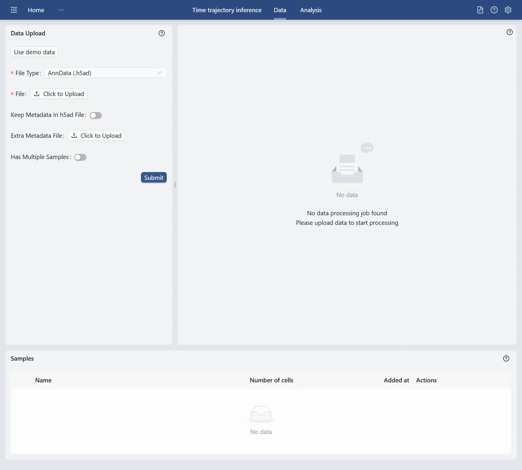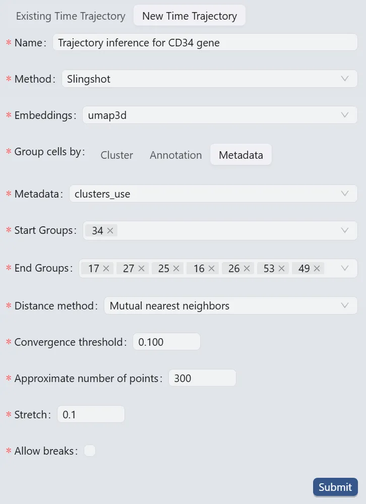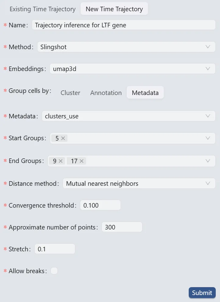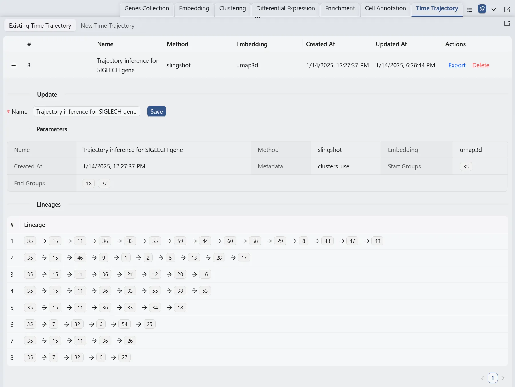 Once the trajectory inference is completed, the results will be added to the Trajectory Inference Table in the Existing Time Trajectory tab.