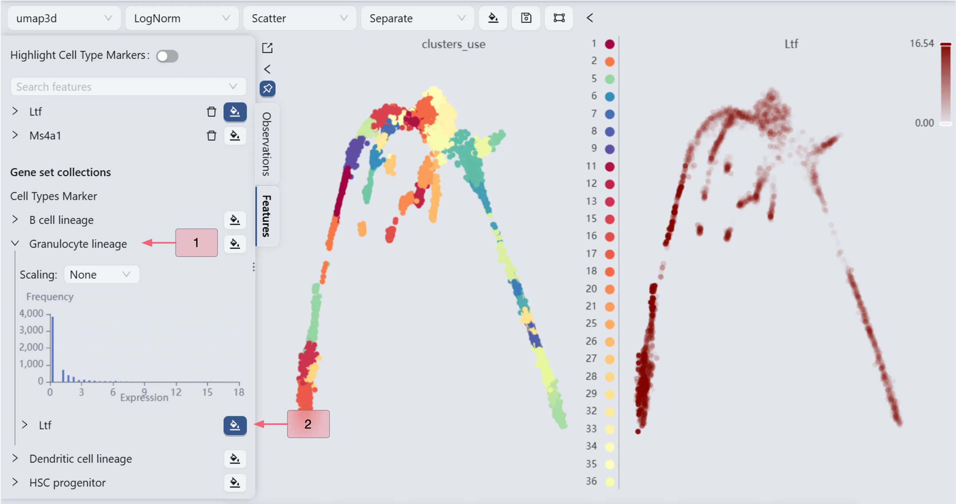 We will observe the expression of the Ltf gene to manually select the starting and ending points for the Slingshot method parameters.