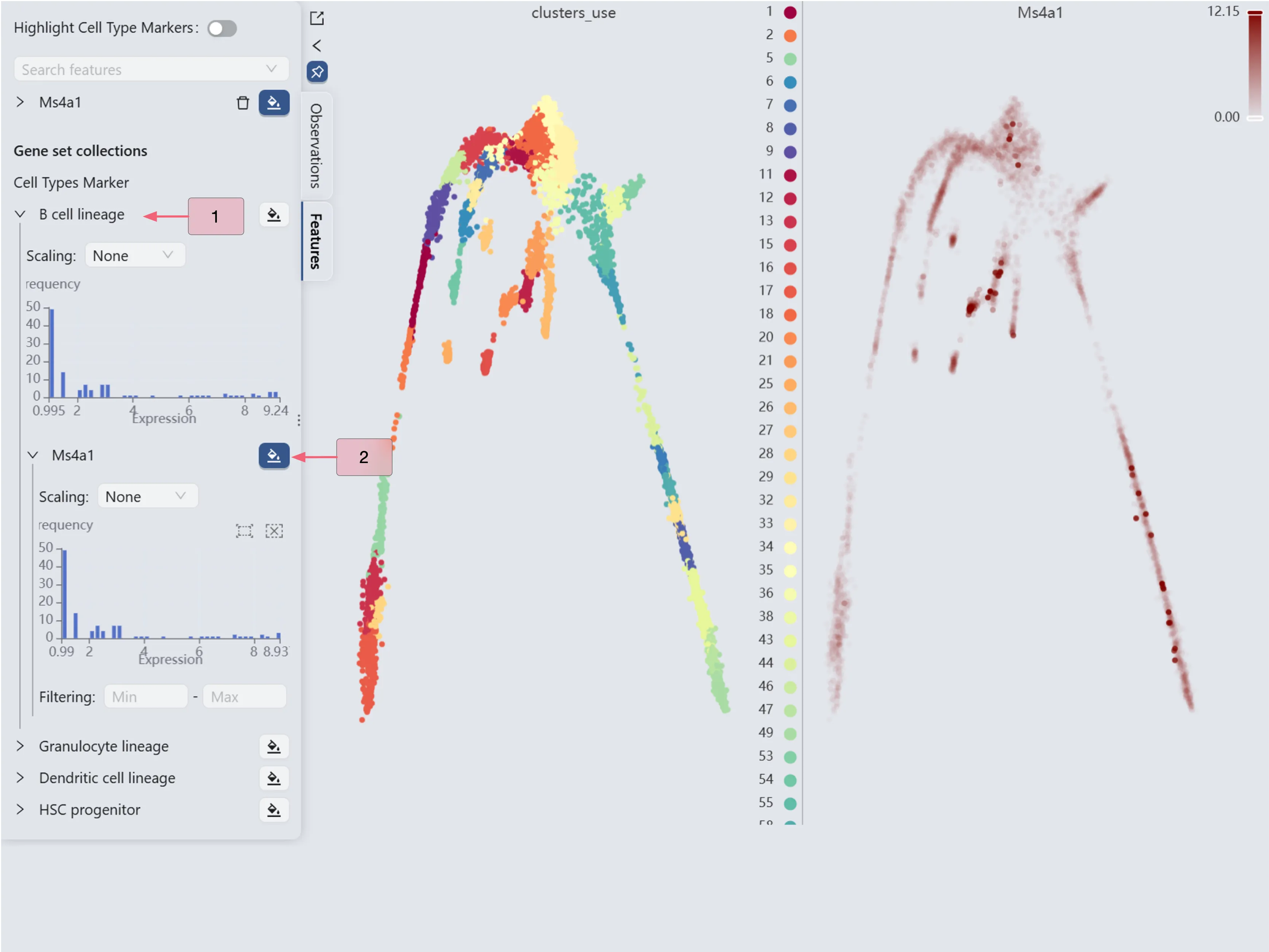 The Slingshot method requires specifying the starting and ending points for its parameters. Therefore, we will observe the expression of the Ms4a1 gene to manually select the starting and ending points.