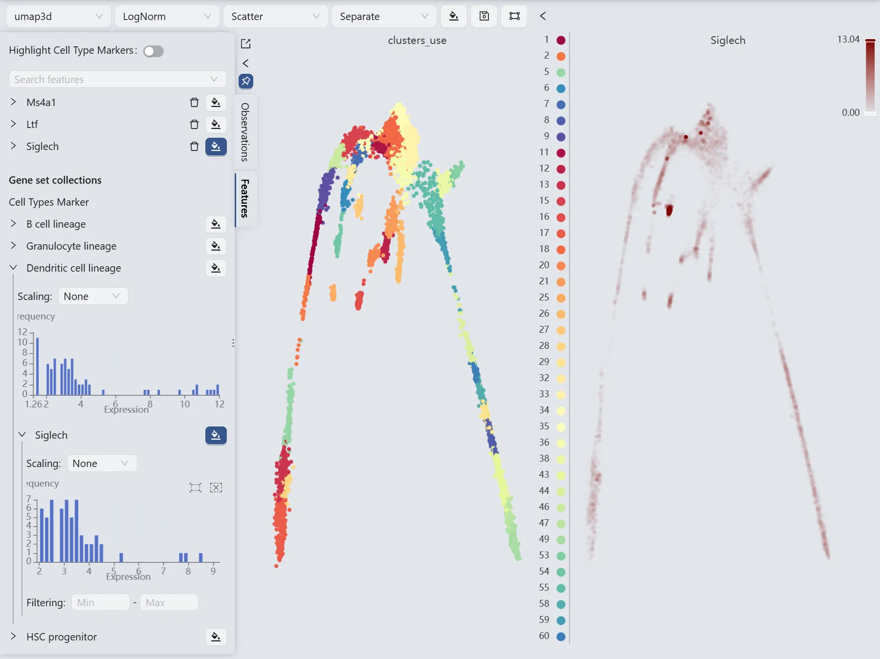 We will observe the expression of the Siglech gene to manually select the starting and ending points for the Slingshot method parameters.