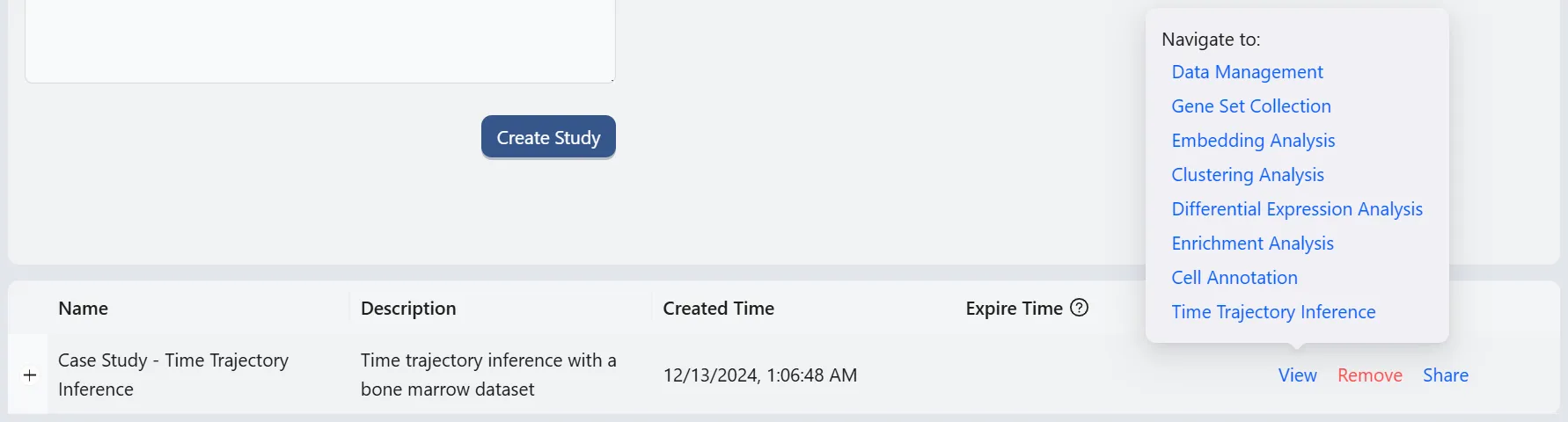 A new study will be created and added to the study table. You can use this table to manage your studies or navigate to the other pages. For more details about managing study, refer to Study Management page.