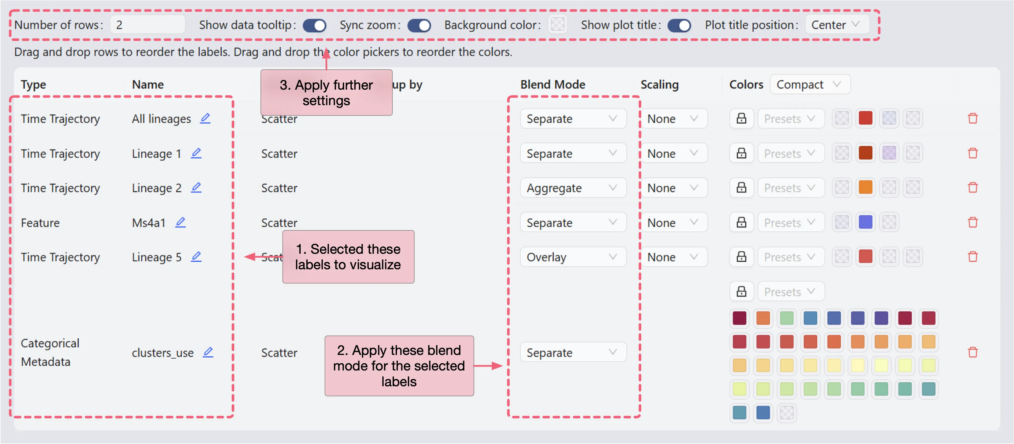 Top Toolbar: Contains dropdown menus for selecting embedding, data normalization, plot type, blending mode, and color map.