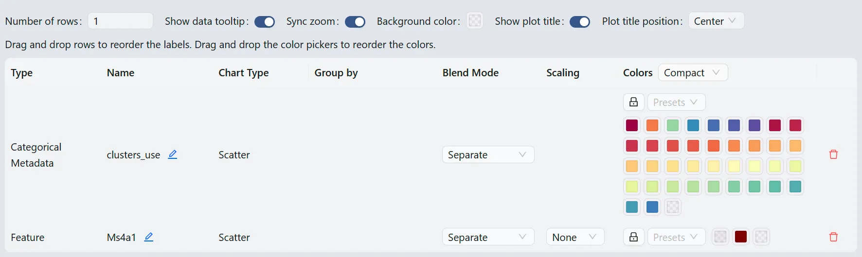 Enable. When enabled, zooming in on one scatter plot will zoom in on all scatter plots in the grid.Show plot title:
