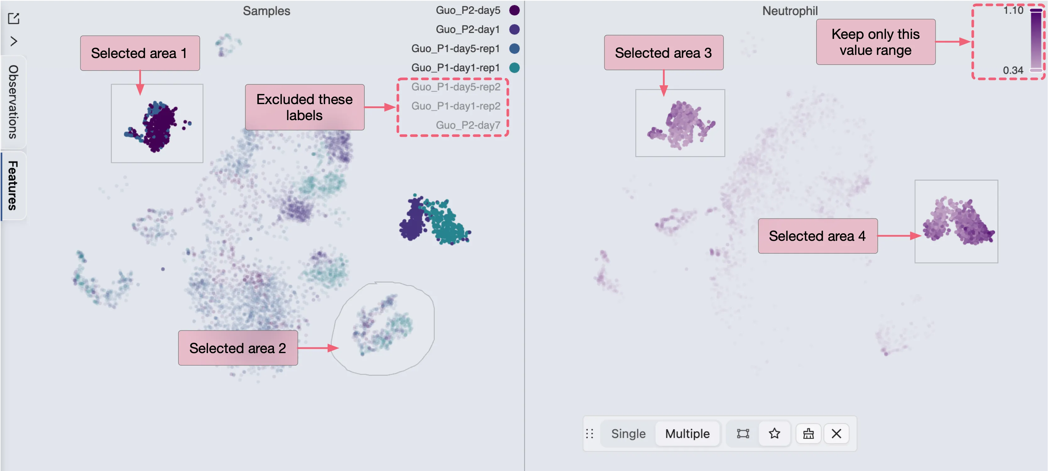 To filter cells based on samples, select the samples you want to filter from the Sample dropdown. Only cells from the selected samples will be included in the final selection.