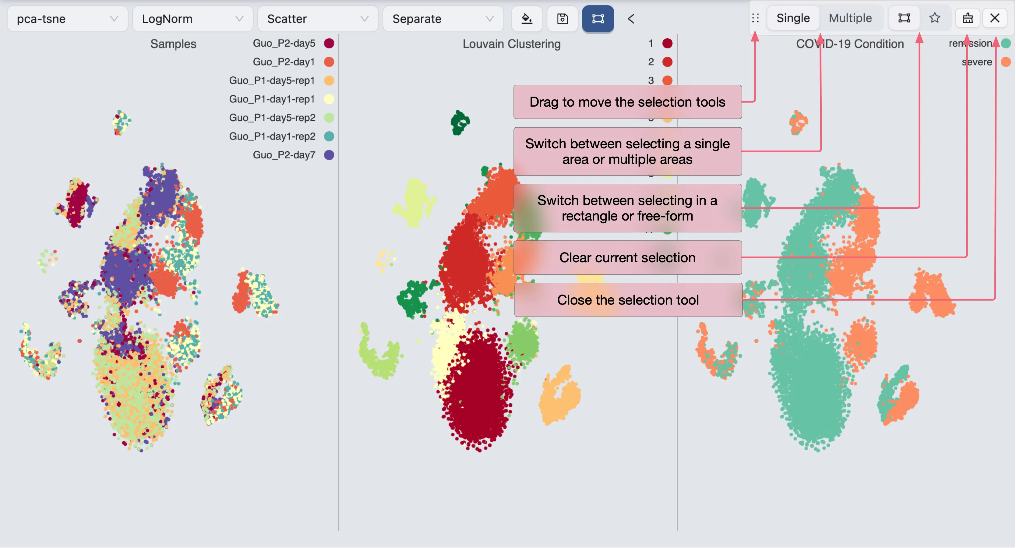 To begin selecting cells, simple draw a shape on the plot. The image below shows an example of selecting cells from two scatter plots: