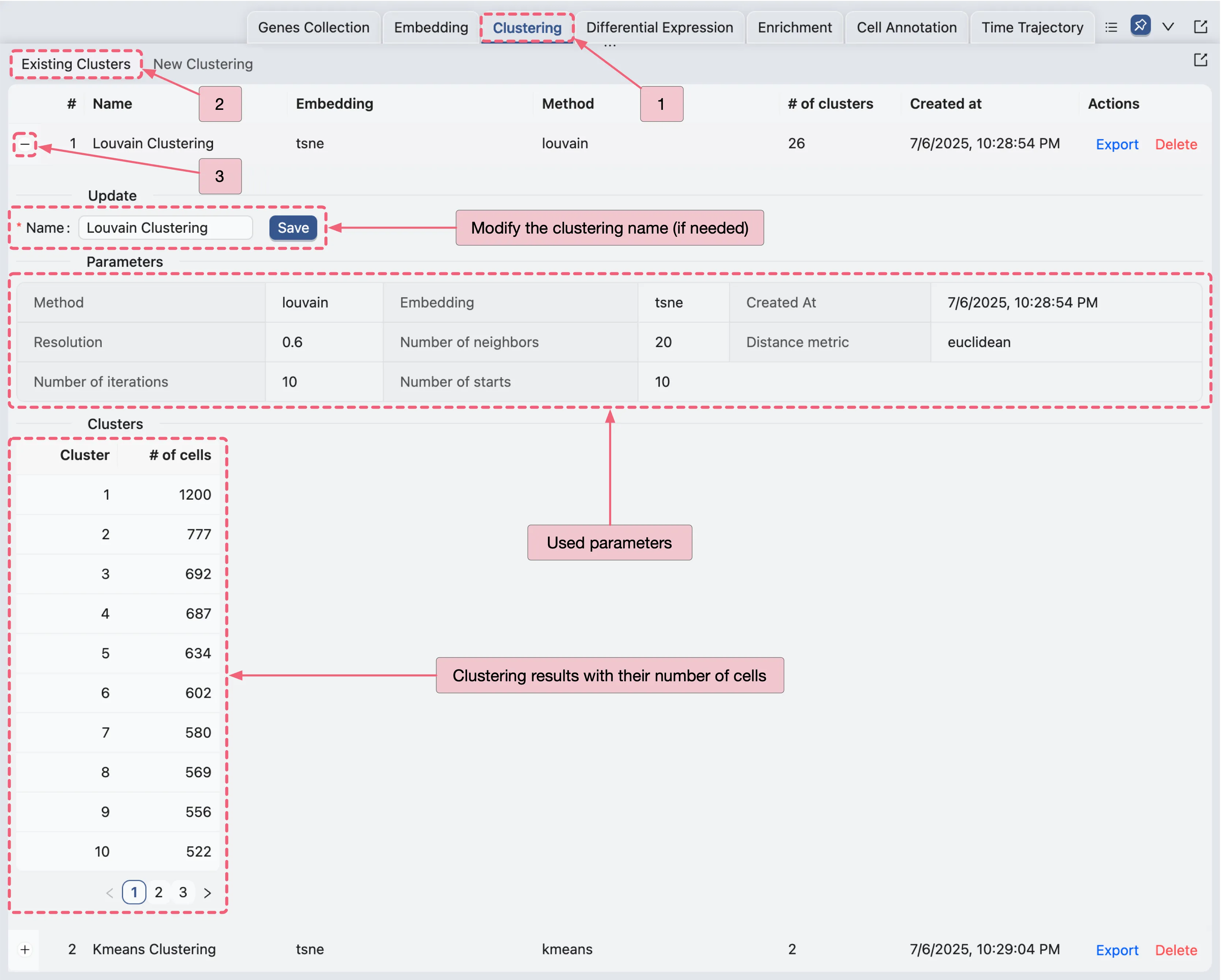 On the existing clustering table, you can see all the clustering analyses you have performed. To view the details of a specific clustering analysis, click the