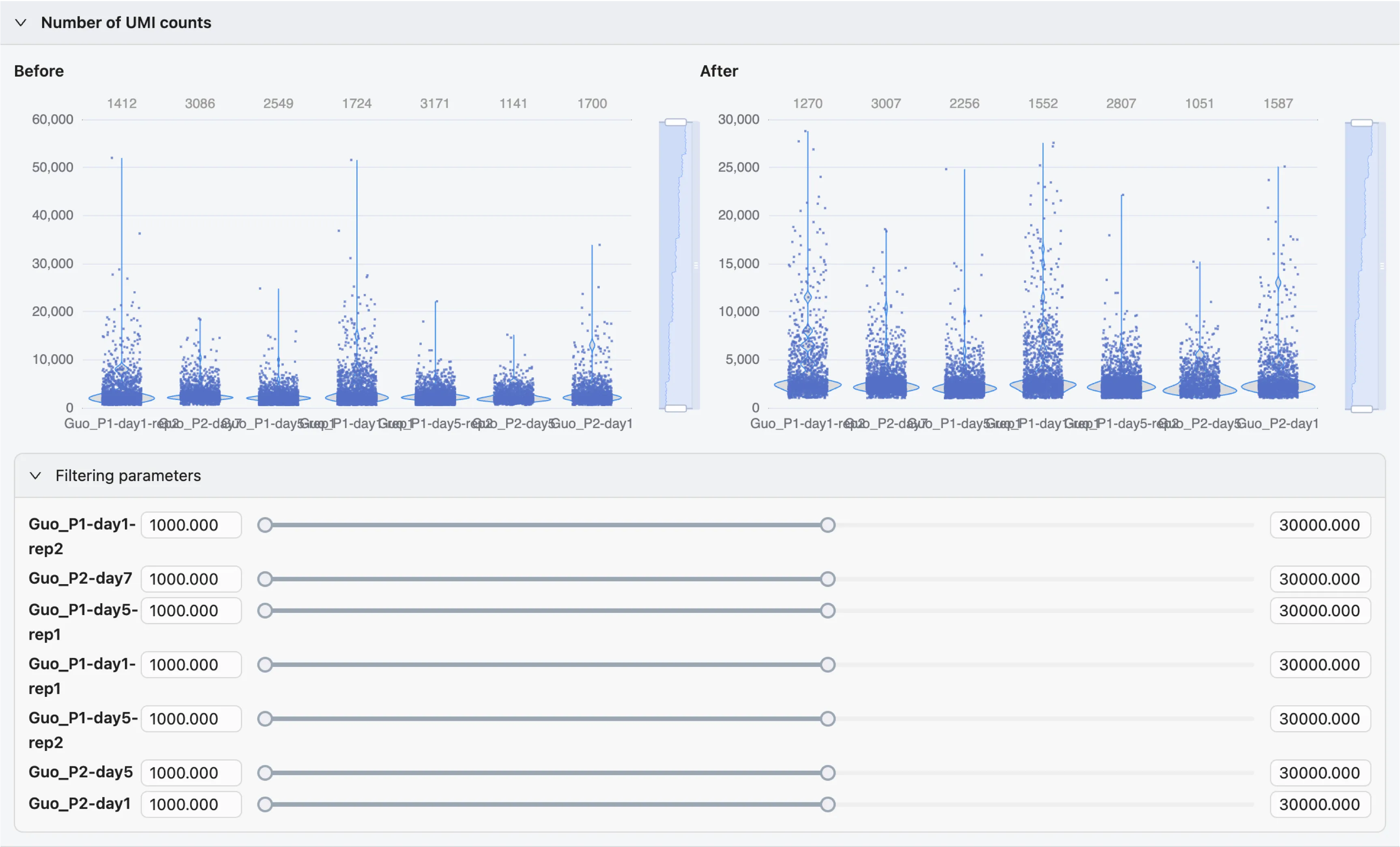 Before Filtering: The distribution of the selected metric before applying the filter.After Filtering: The distribution of the selected metric after applying the filter.If you have multiple samples, each sample will be displayed in a different column of the violin plot.