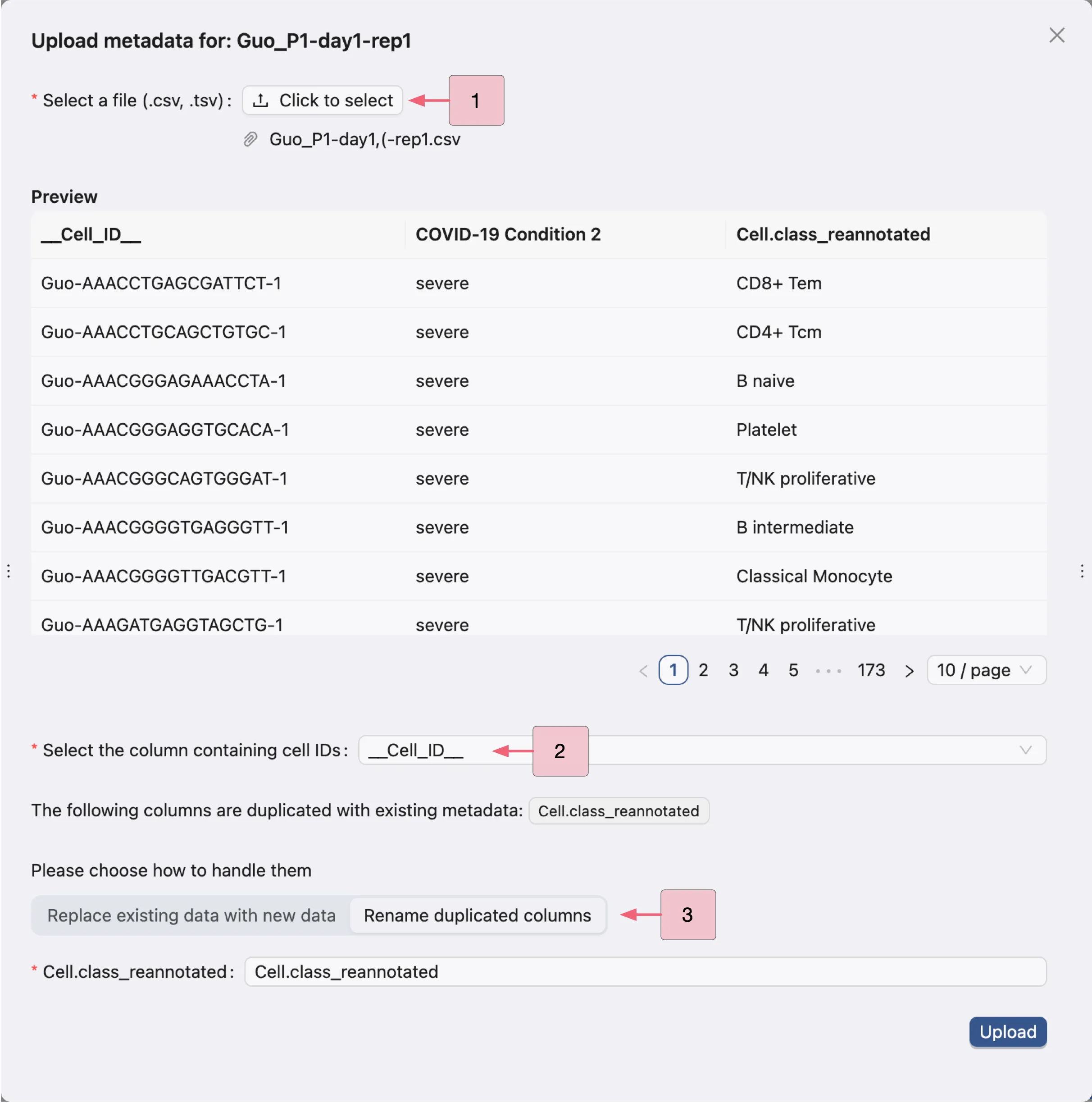 In case the metadata file contains columns with the same name as the existing metadata, select whether to: