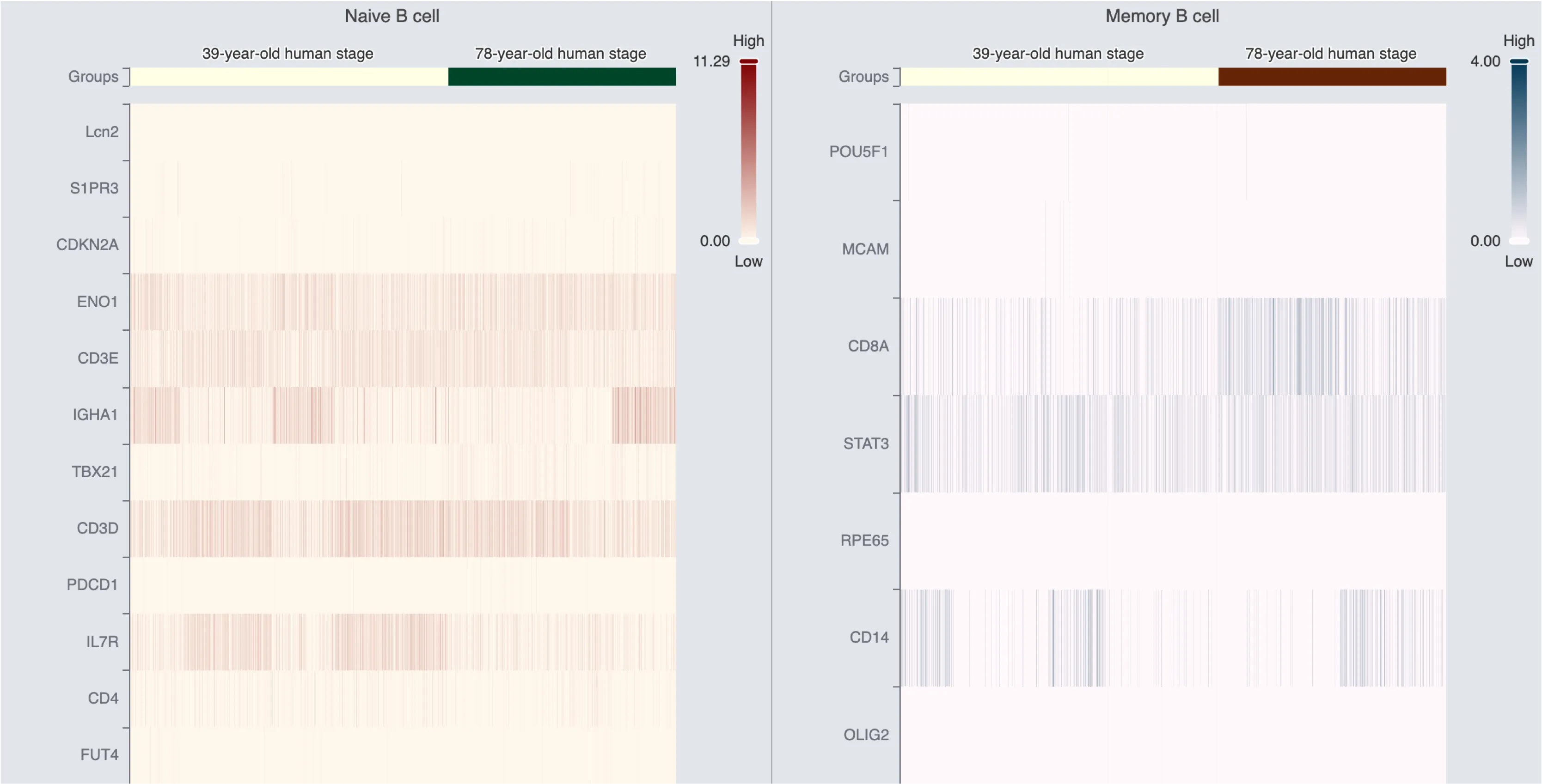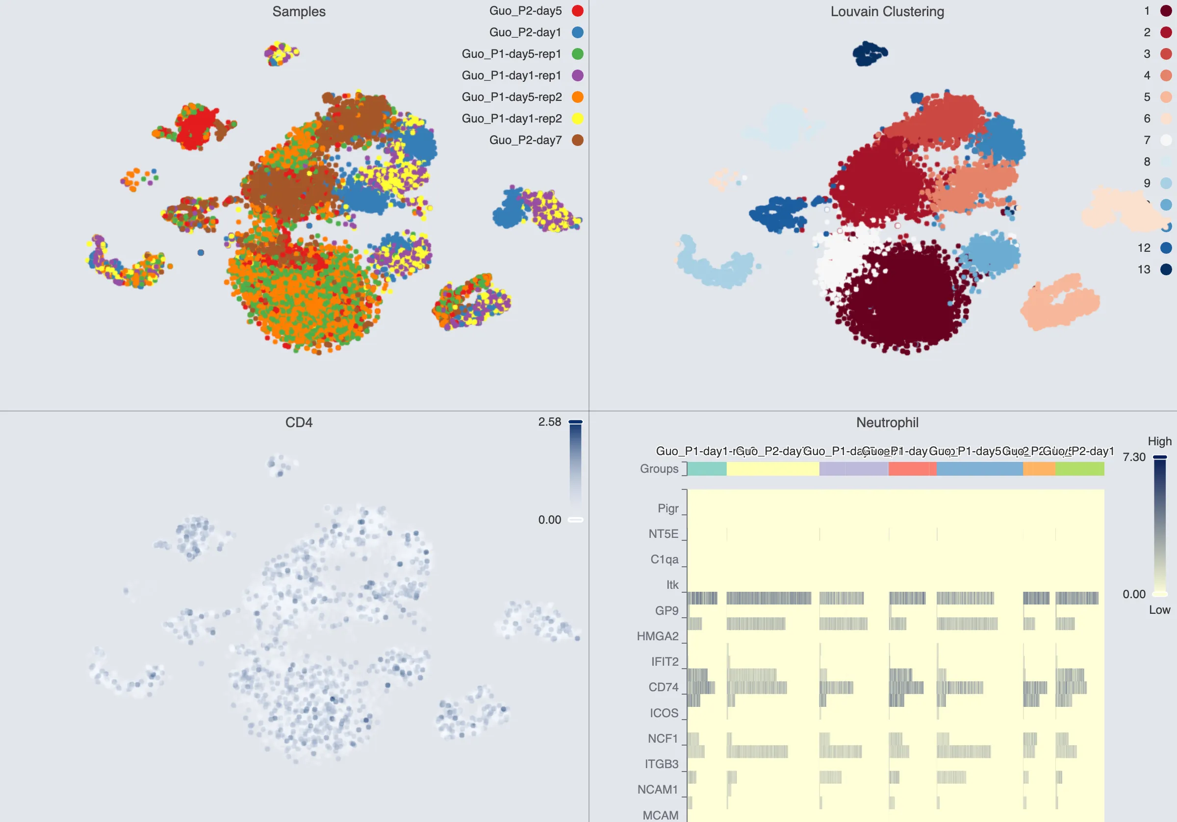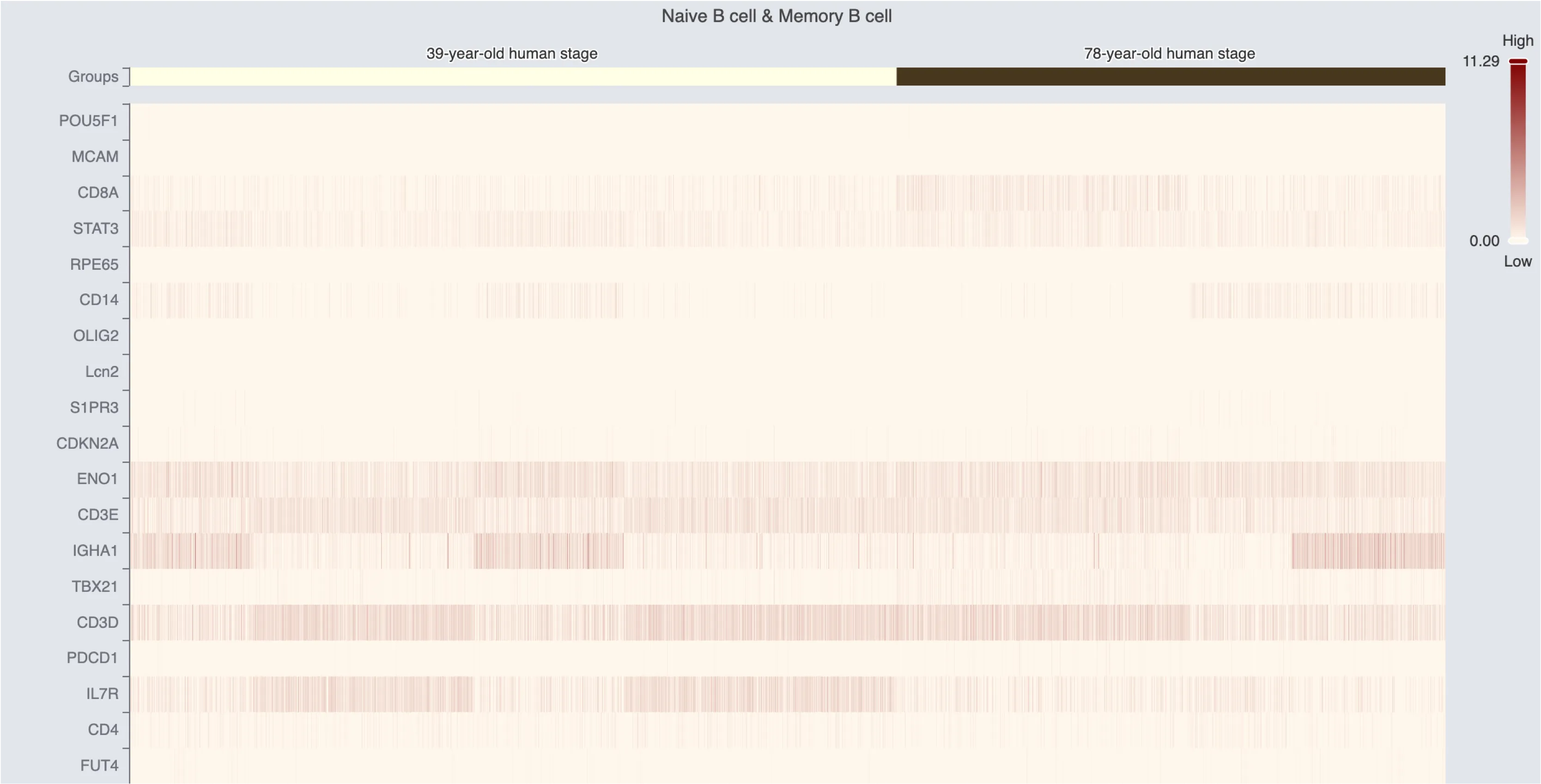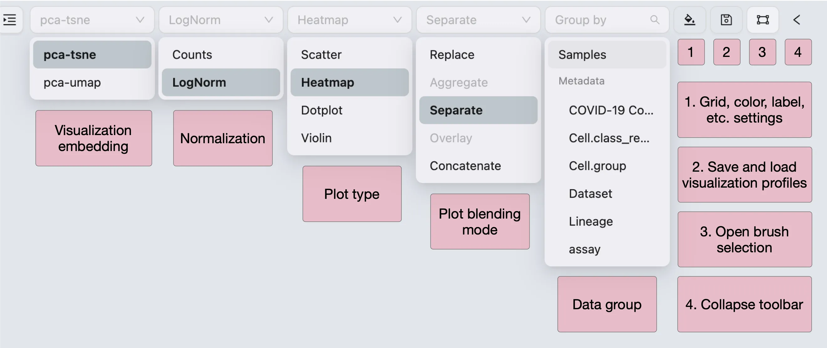 Data grouping: Select the grouping for heatmap, dot plot, and violin plot. You can select multiple groupings, and they will be combined in the visualization.