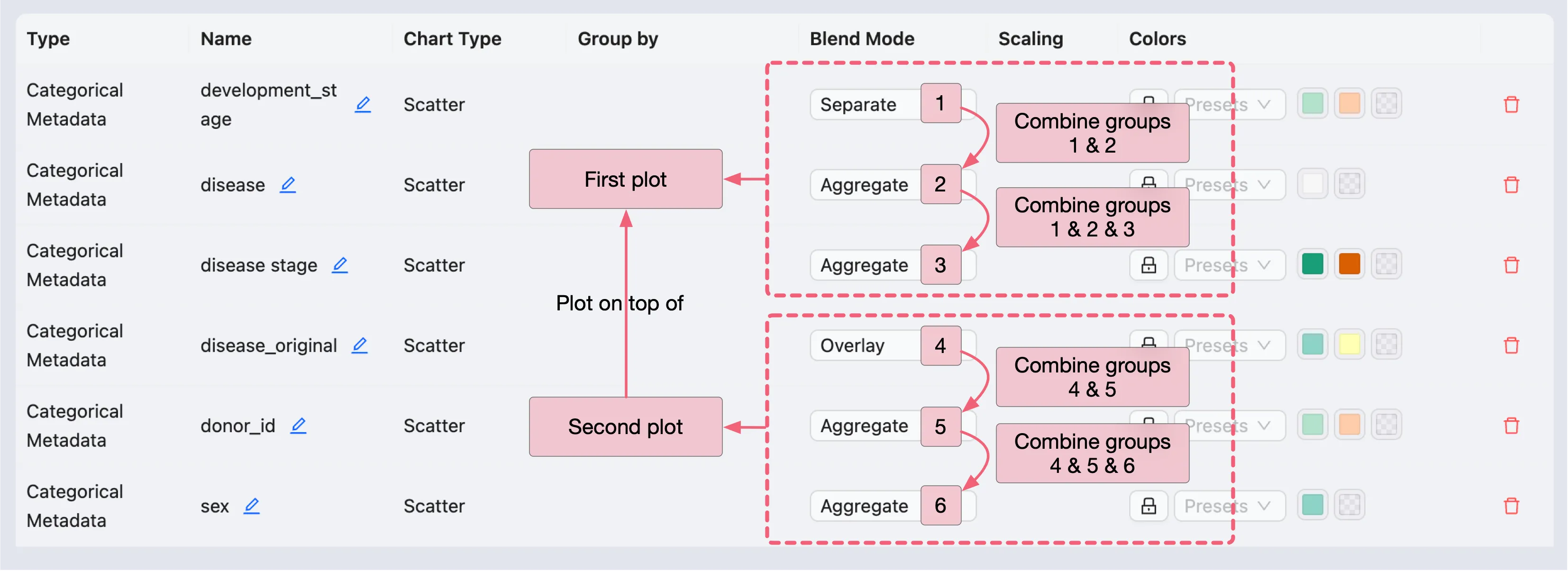 When using the Aggregate blend mode, the visualization engine will try to combine the grouping and the color mapping of the new plot with the current plot.