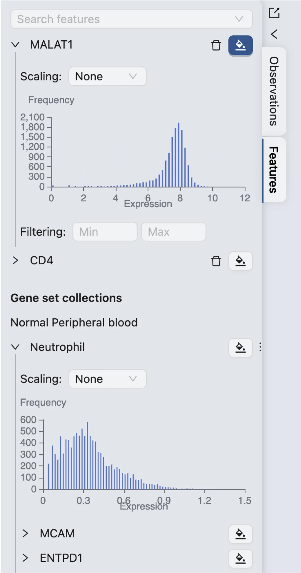 Under the histogram, you can filter the feature expression values by providing the minimum and maximum values.