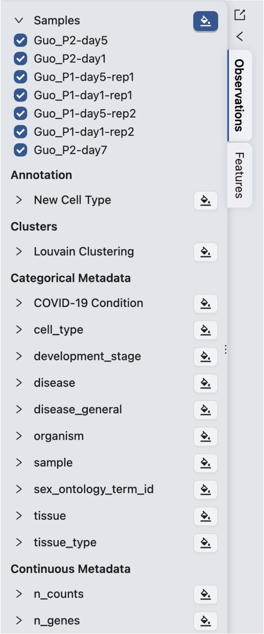 Observations are the data points in the visualization. Each observation represents a cell in a sample. There are 5 main types of observation labels: