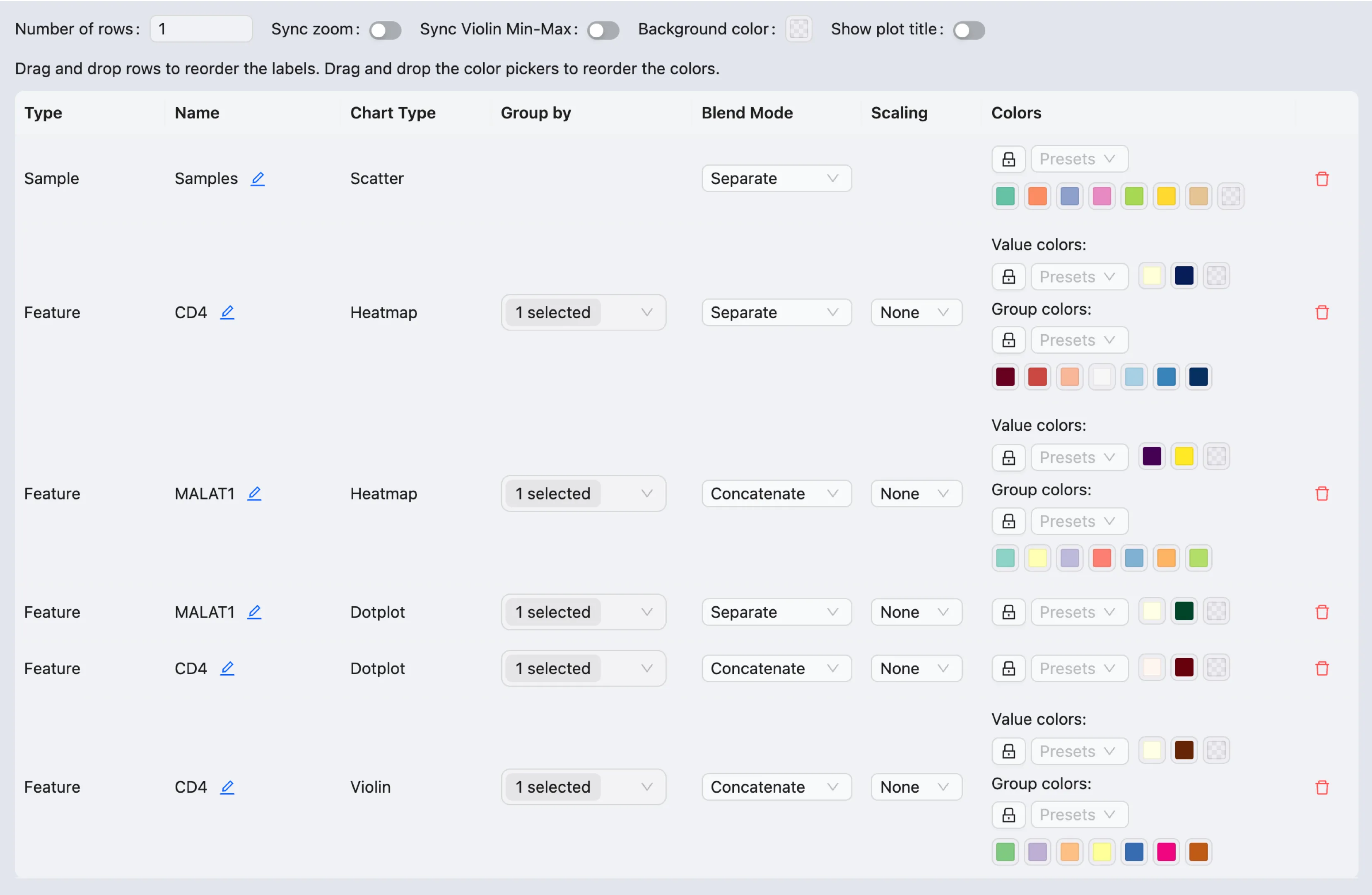 heatmap,dot plot, andviolin plot.Blend Mode: The blending mode used in the plot. The blend mode can be used to combine multiple plots into one visualization. See Blend Mode for details how to use blending modes.
