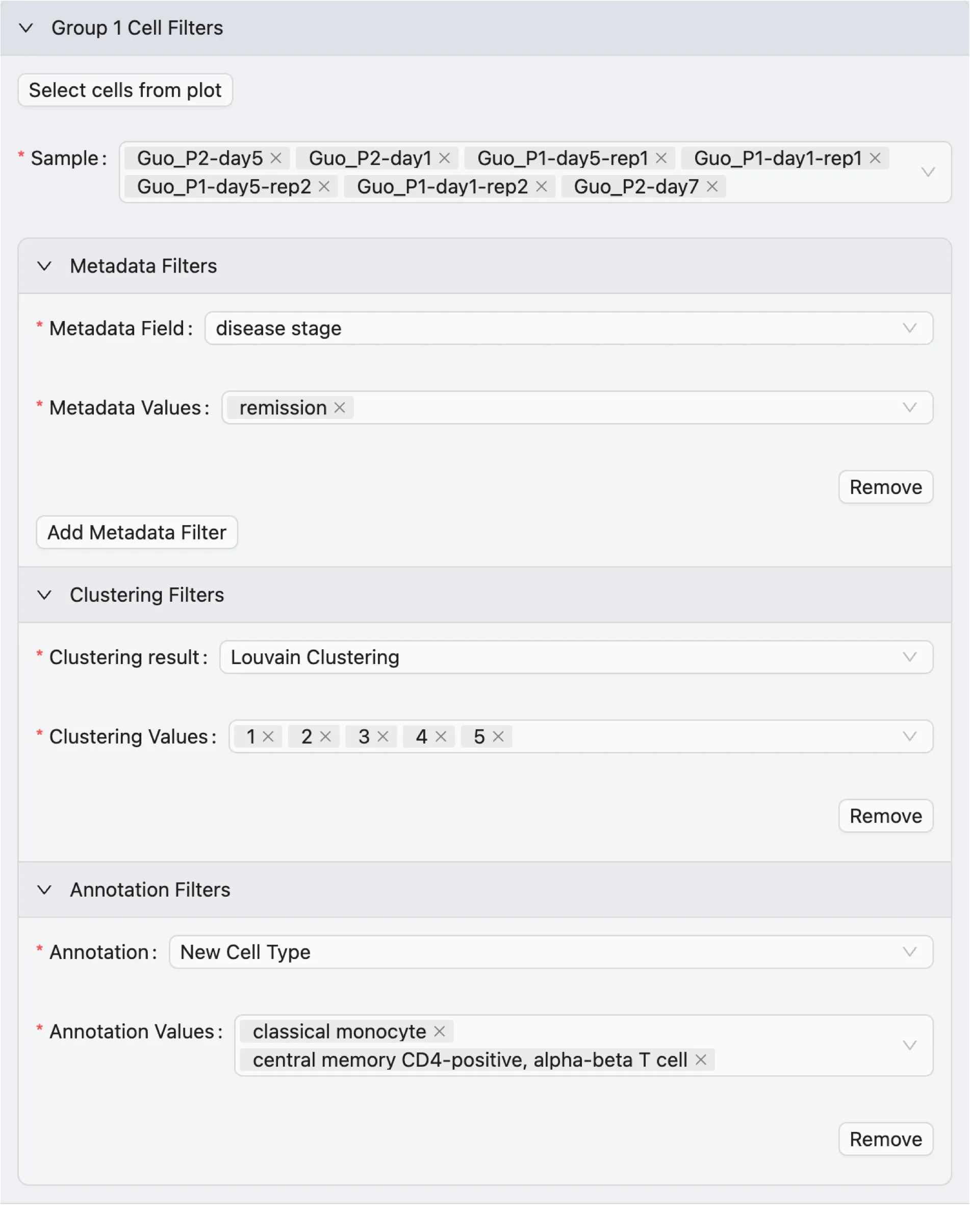 Clustering Filters and Annotation Filters: Add filters to include cells based on clustering results or annotations. Similar to metadata filters, you can select the clustering result or annotation and the values to filter cells.
