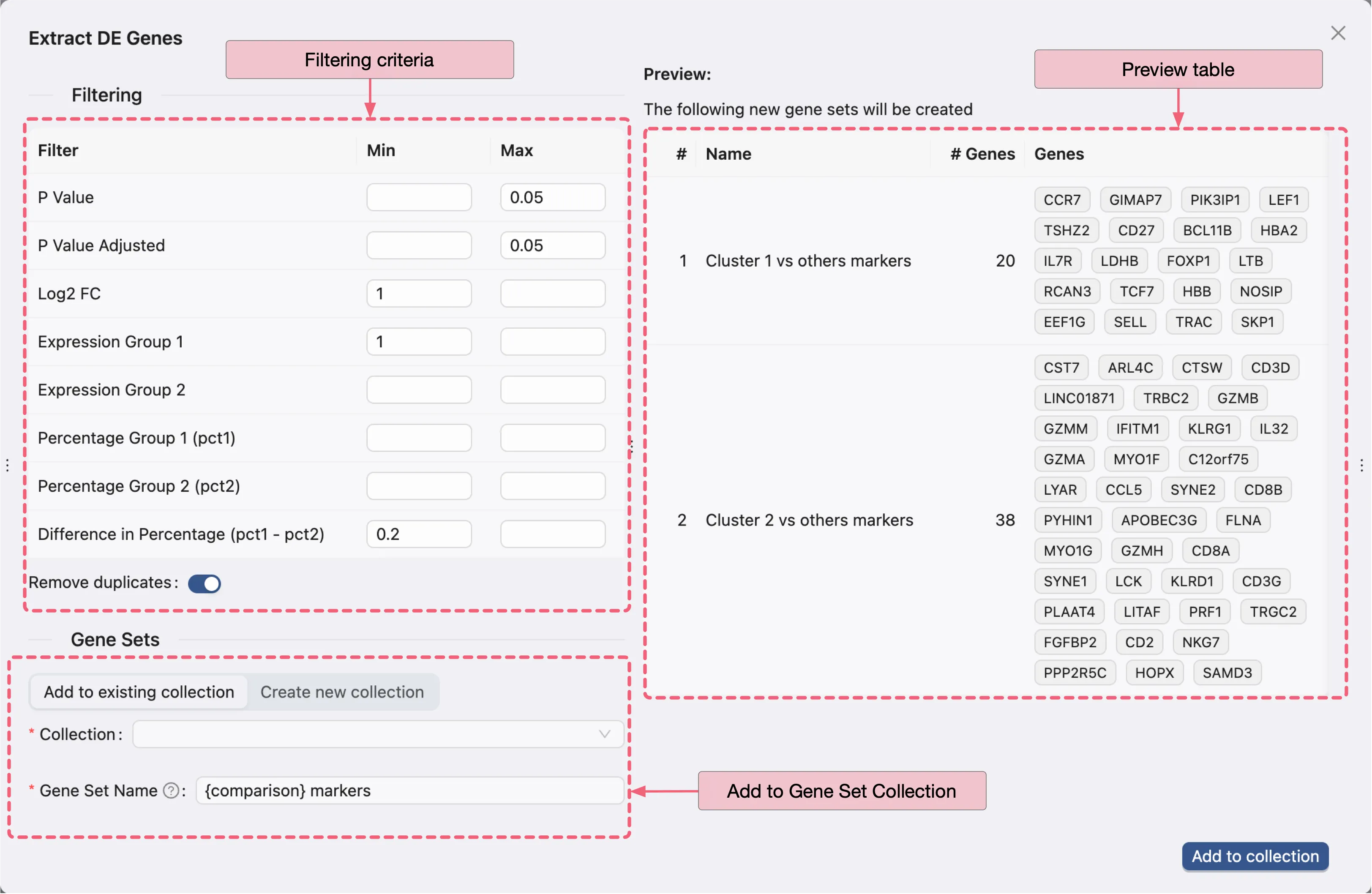Finally, click Add to collection to add the extracted DE genes to the selected gene set collection.