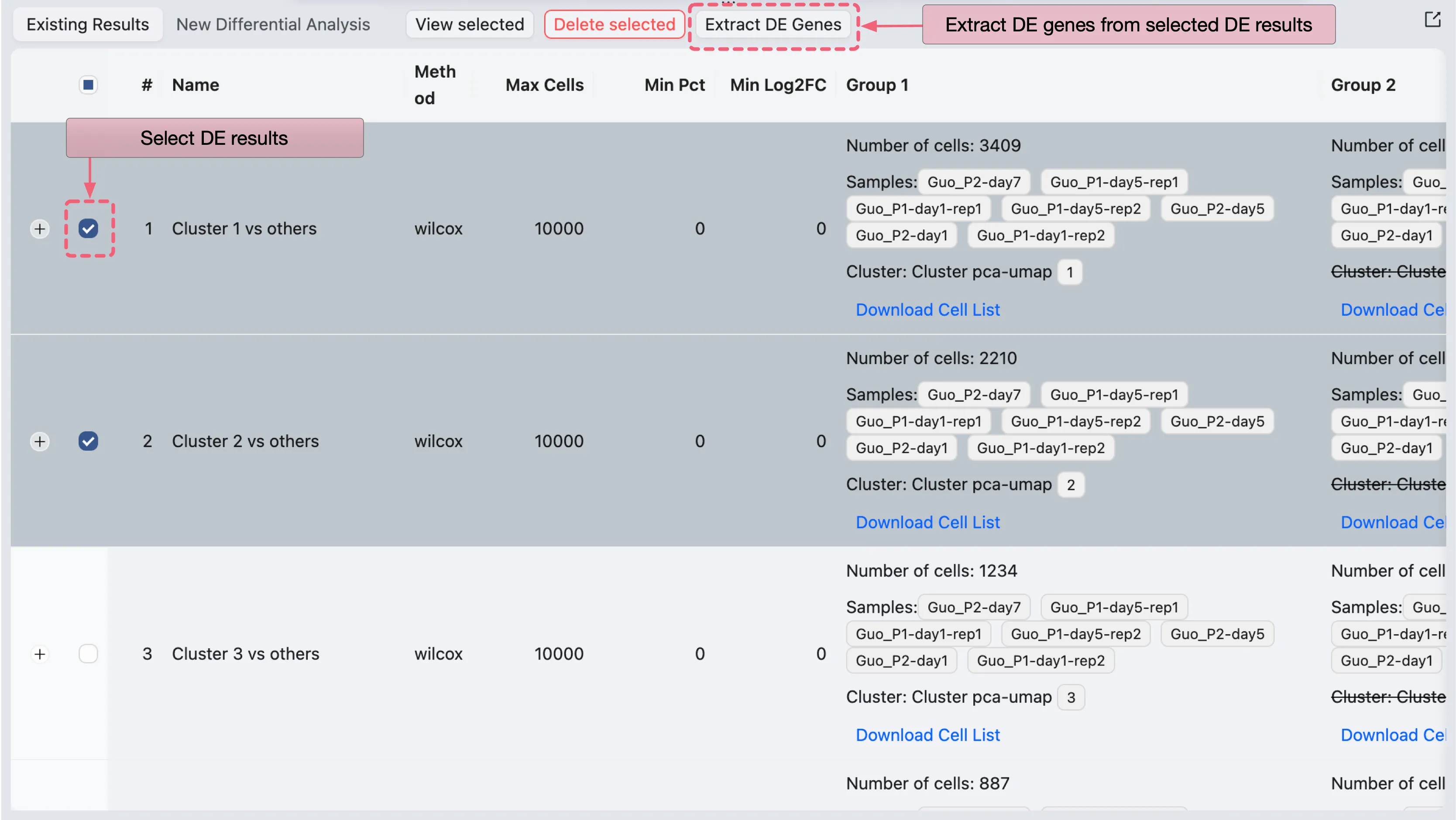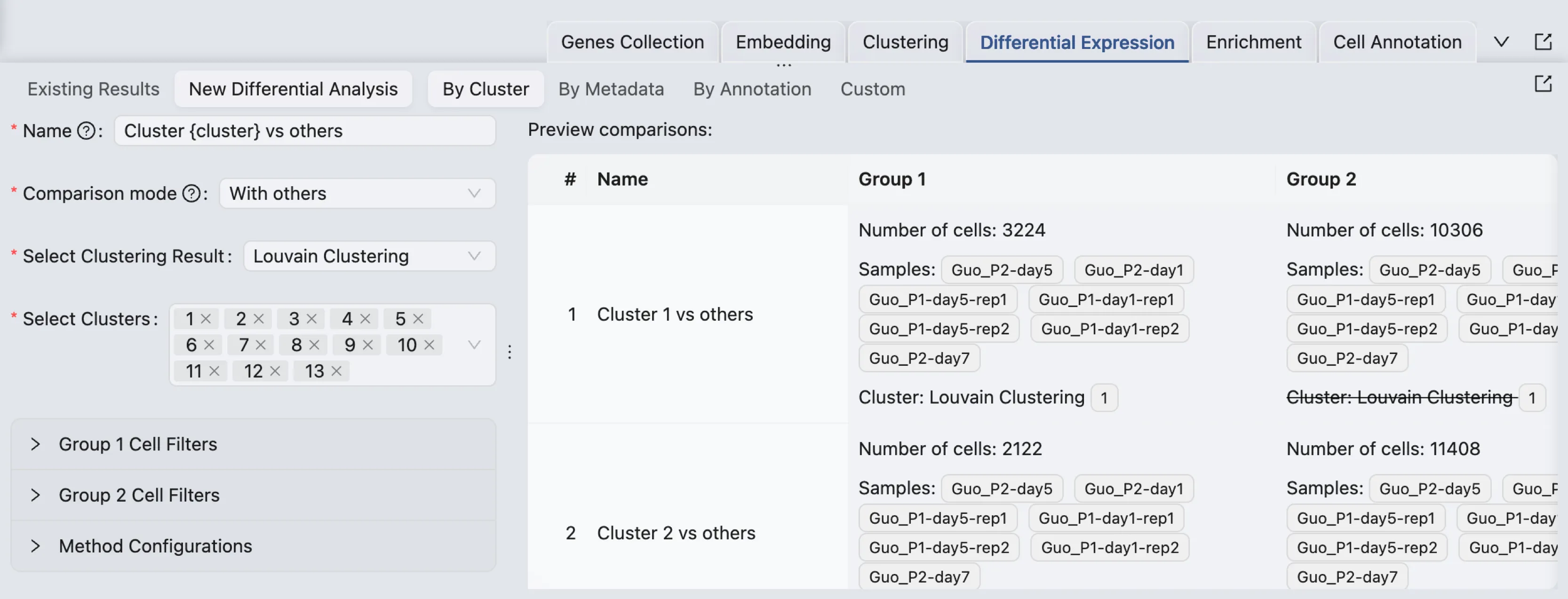 1,2, and3, and you add a filter to defineGroup 1as cells with metadata fielddisease_statusisDisease, andGroup 2as cells with metadata fielddisease_statusisHealthy, three analyses will be performed:1 (Disease) vs 1 (Healthy),2 (Disease) vs 2 (Healthy), and3 (Disease) vs 3 (Healthy).