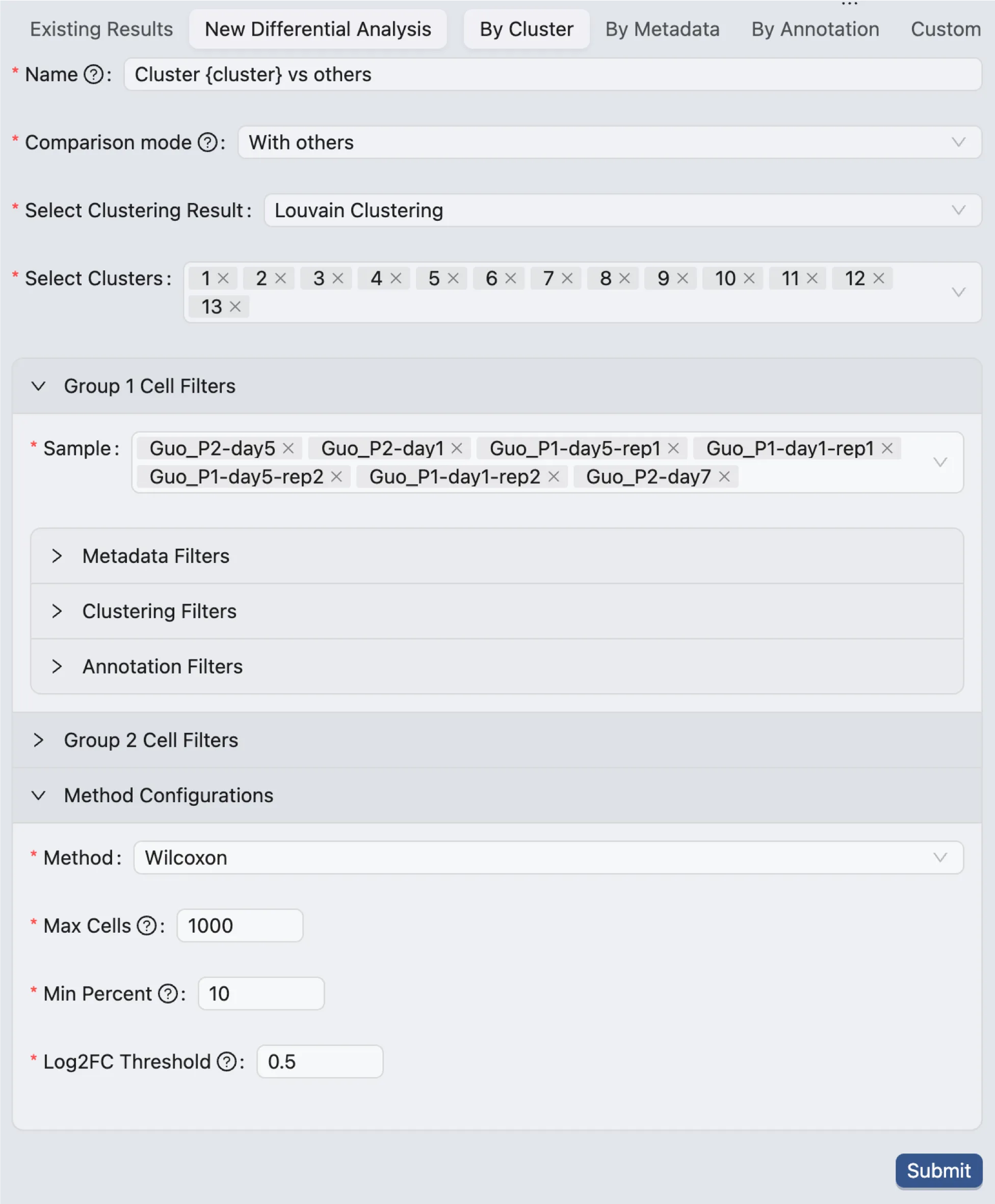 Analysis Type: Select the type of analysis you want to perform. The options are By Cluster, By Metadata, By Annotation, and Custom.