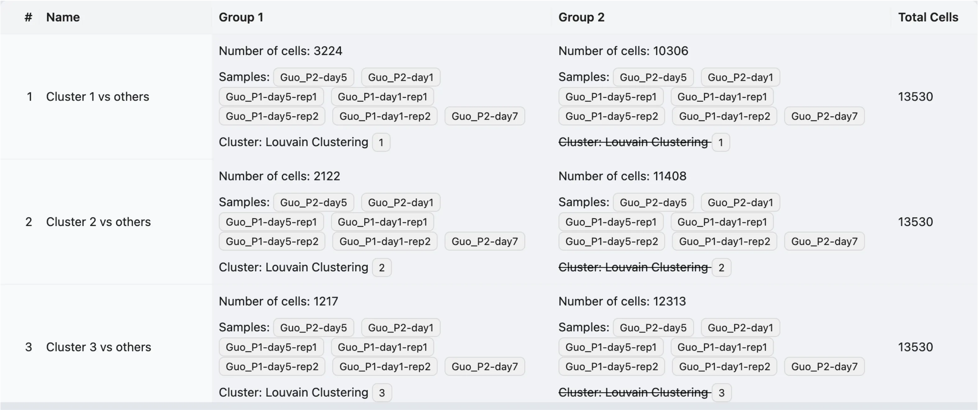 In the preview table, a strike-through indicates that the filter is to exclude cells. For example, Louvain Clustering 1 means that cells belonging to Louvain Clustering 1 will be excluded from the group.