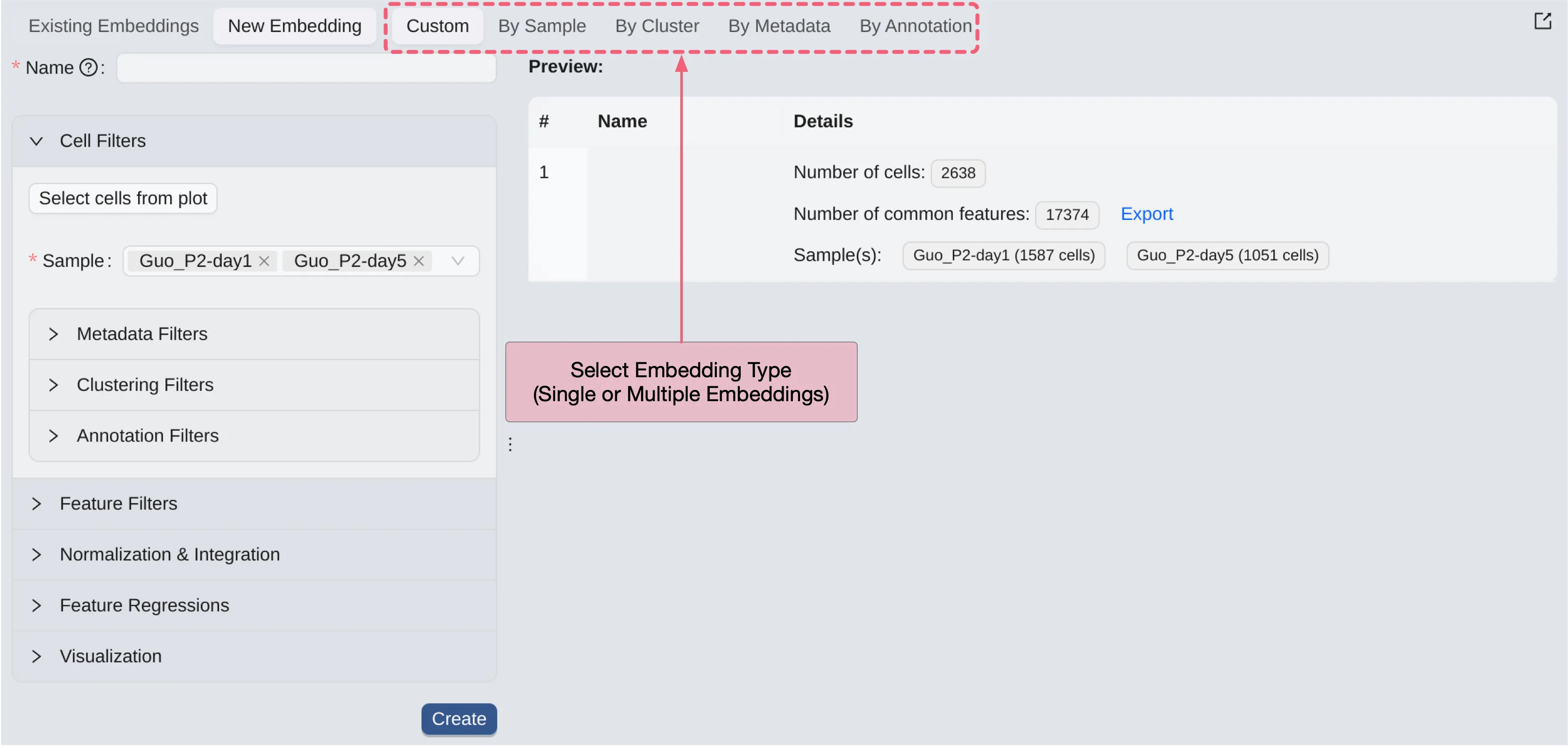 Custom: Create a single embedding based on your selection.By Sample: Create one embedding for each selected sample.By Cluster: Create one embedding for each selected cluster.By Metadata: Create one embedding for each selected metadata value.By Annotation: Create one embedding for each selected annotation value.