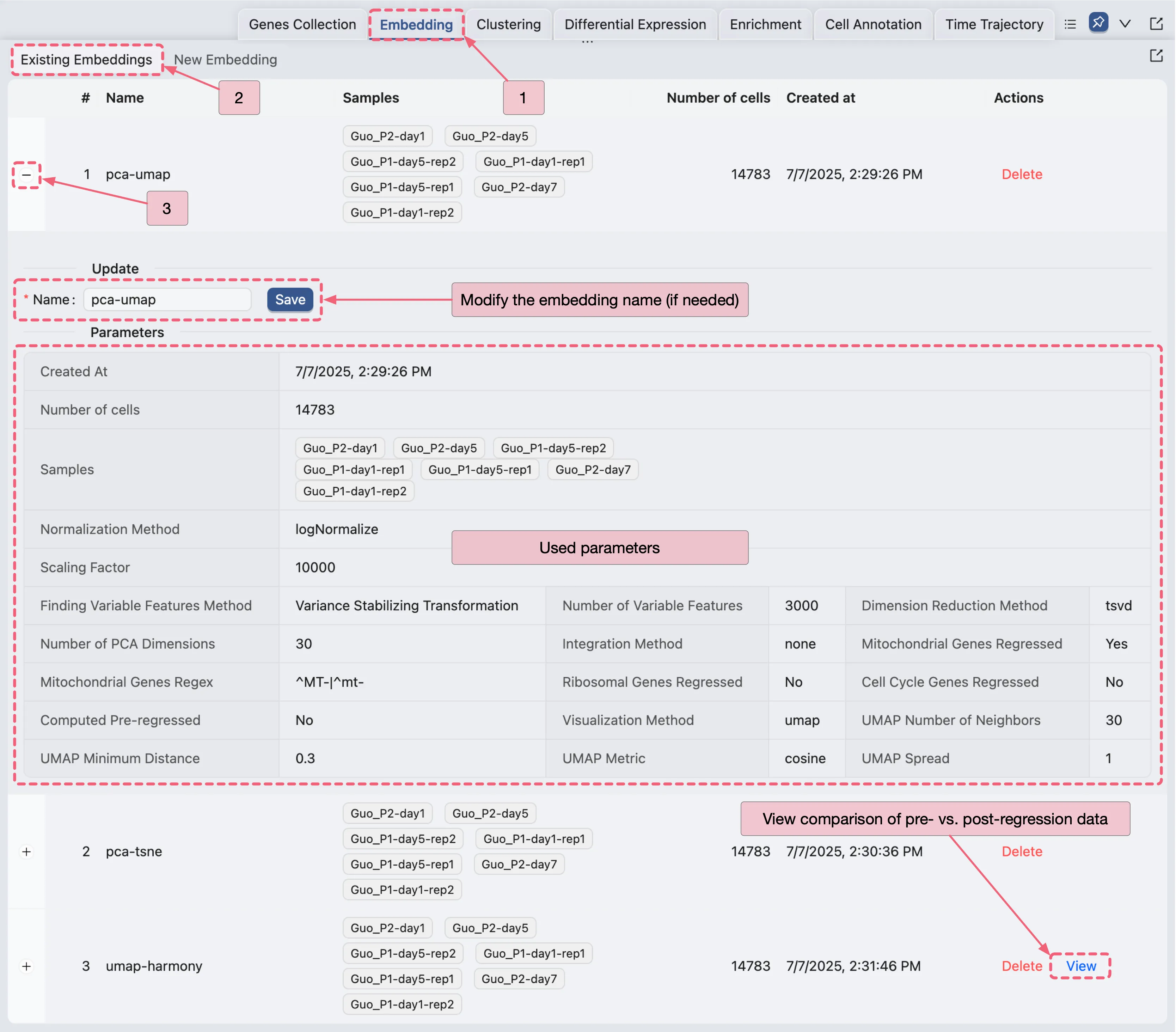 Embedding analysis is a technique used to reduce the dimensionality of data while preserving the structure of the data. In iSCANGuide single-cell RNA sequencing data analysis, embeddings are mainly used to: