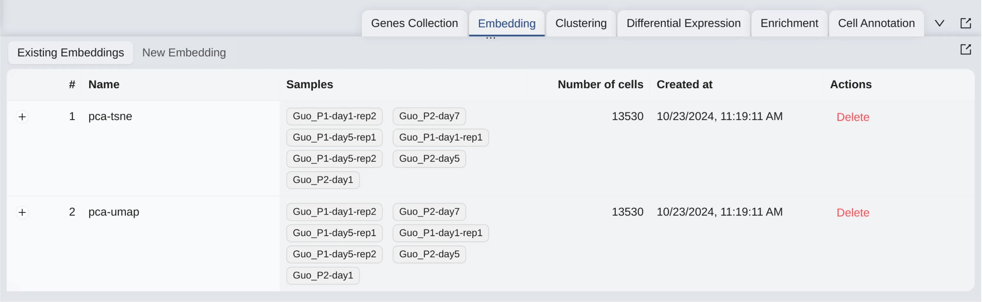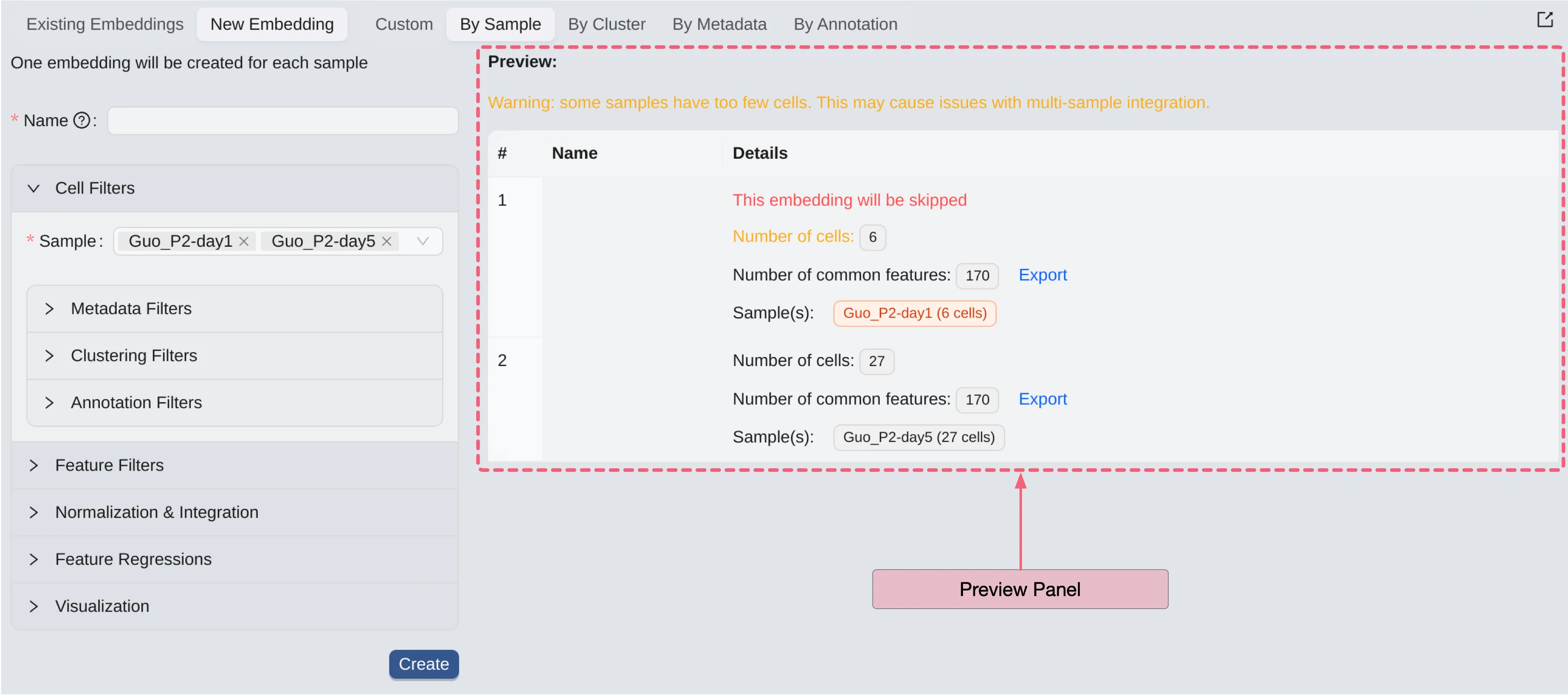 This embedding will be skippedindicates that this embedding will not be created because some filters cause it to not meet the criteria for creating embeddings.Number of cells: The total number of selected cells.Number of common features: The total number of selected features.Sample(s): The selected samples along with their respective number of cells.