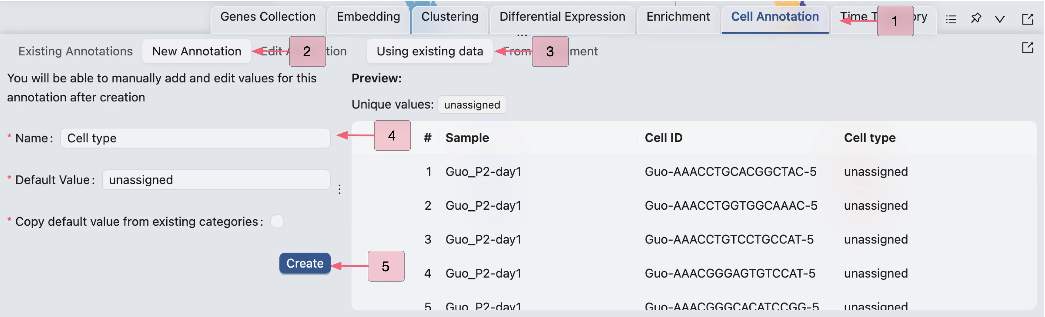iSCANGuide allows you to copy values from existing labels to the new annotation label, as well as create annotation by aggregating enrichment results. Check out Cell Annotation for more details. In this tutorial, we will create a new annotation label with all values set to unassigned, and then manually annotate cells.