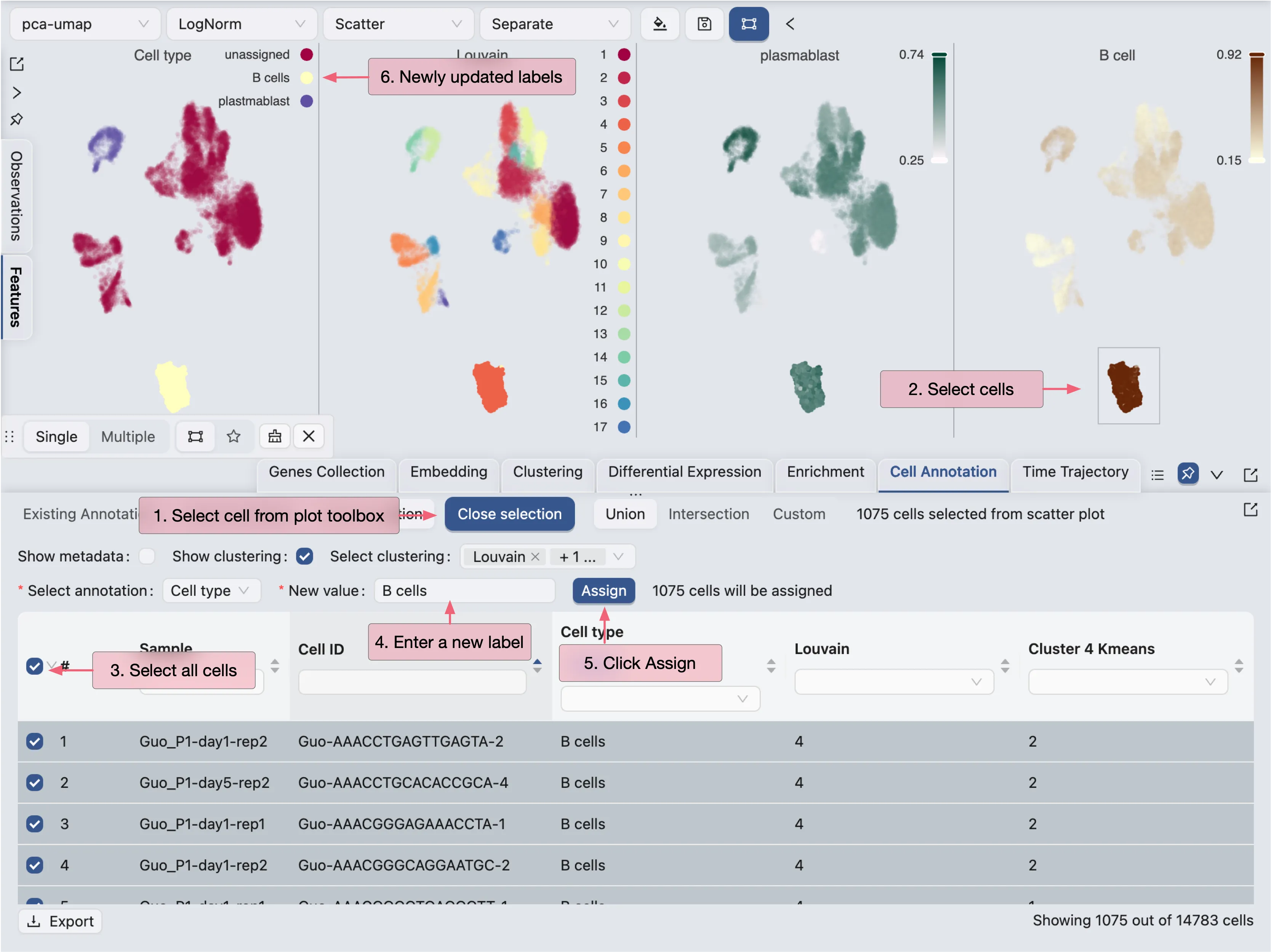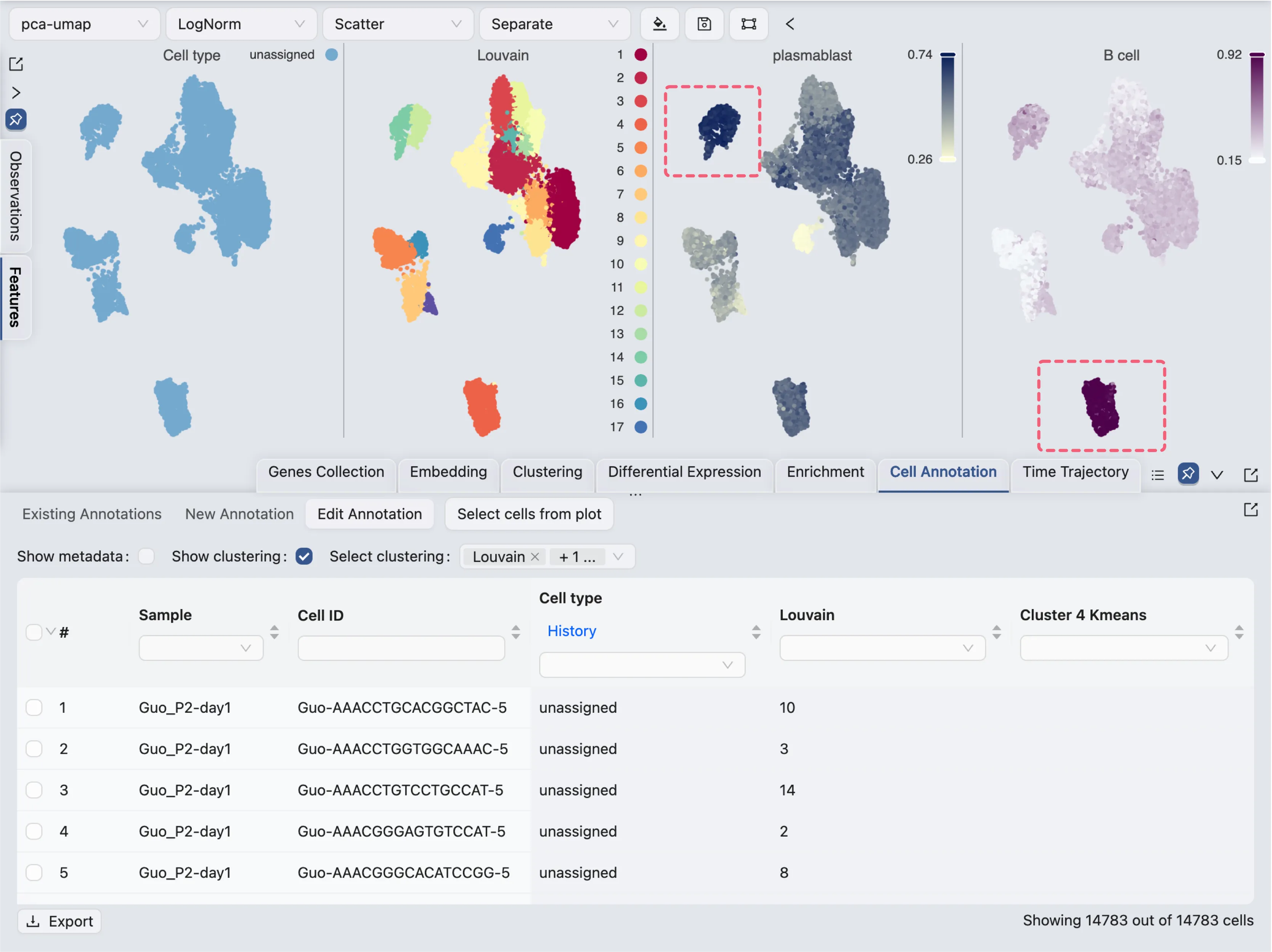 For cluster 4, we will select cells from the visualization and annotate them as B cells.