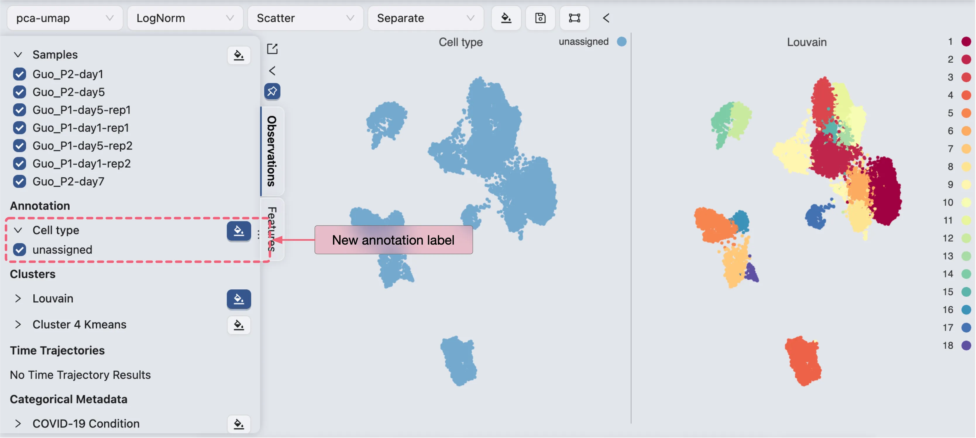 In iSCANGuide, metadata, clusters, and other analysis results are immutable and cannot be directly modified. Instead, you need to create an Annotation Label and make changes to this label.