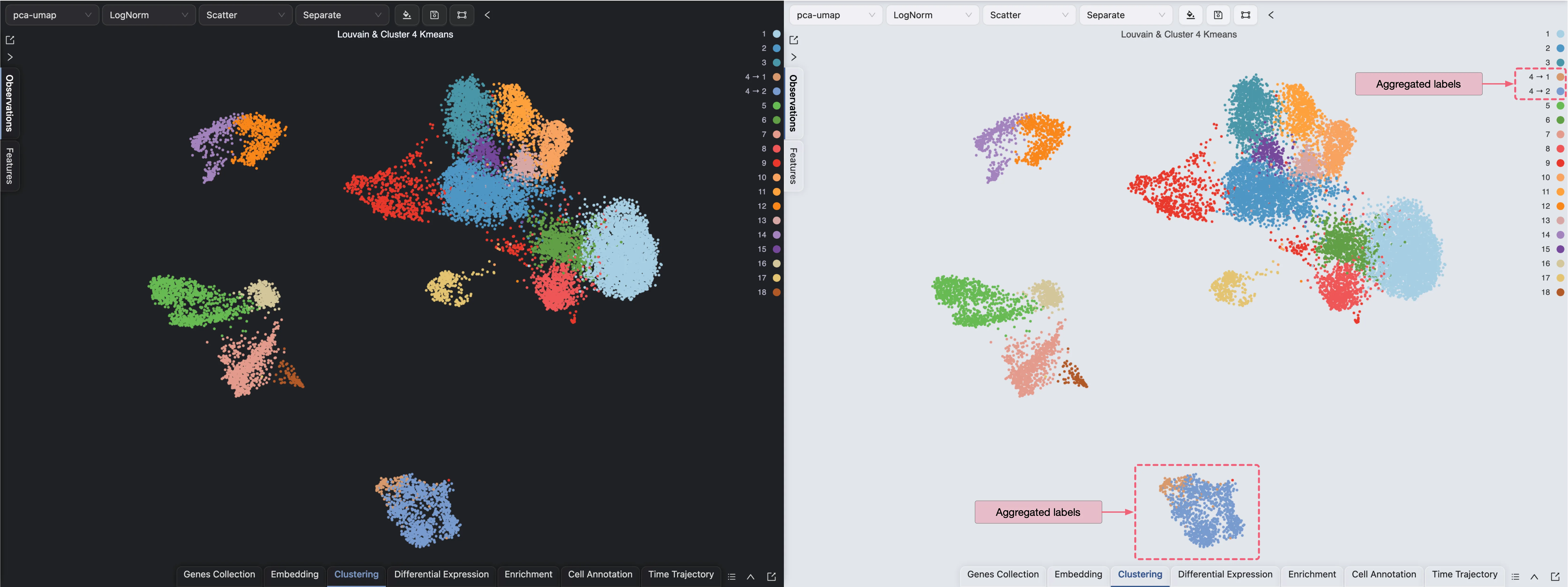 This visualization shows the clustering and sub-clustering results side by side. In iSCANGuide, you can aggregate multiple labels in a single plot by using the Blending mode.