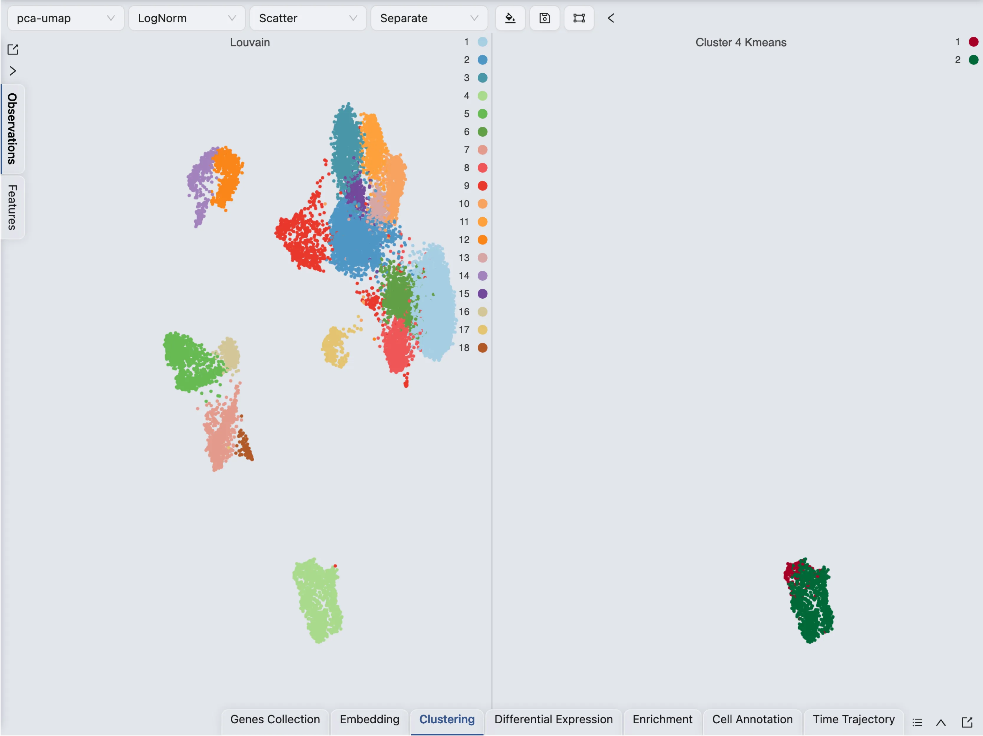 First, change the Blending mode to Separate in the Top Toolbar so that each cluster is visualized separately. Next, select the clustering and sub-clustering results in the Left Sidebar to visualize them.
