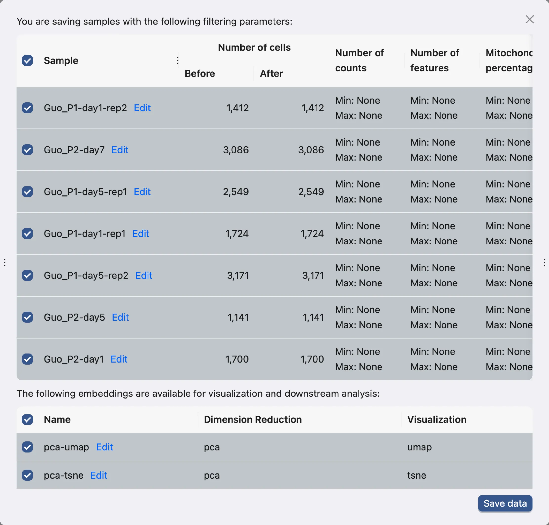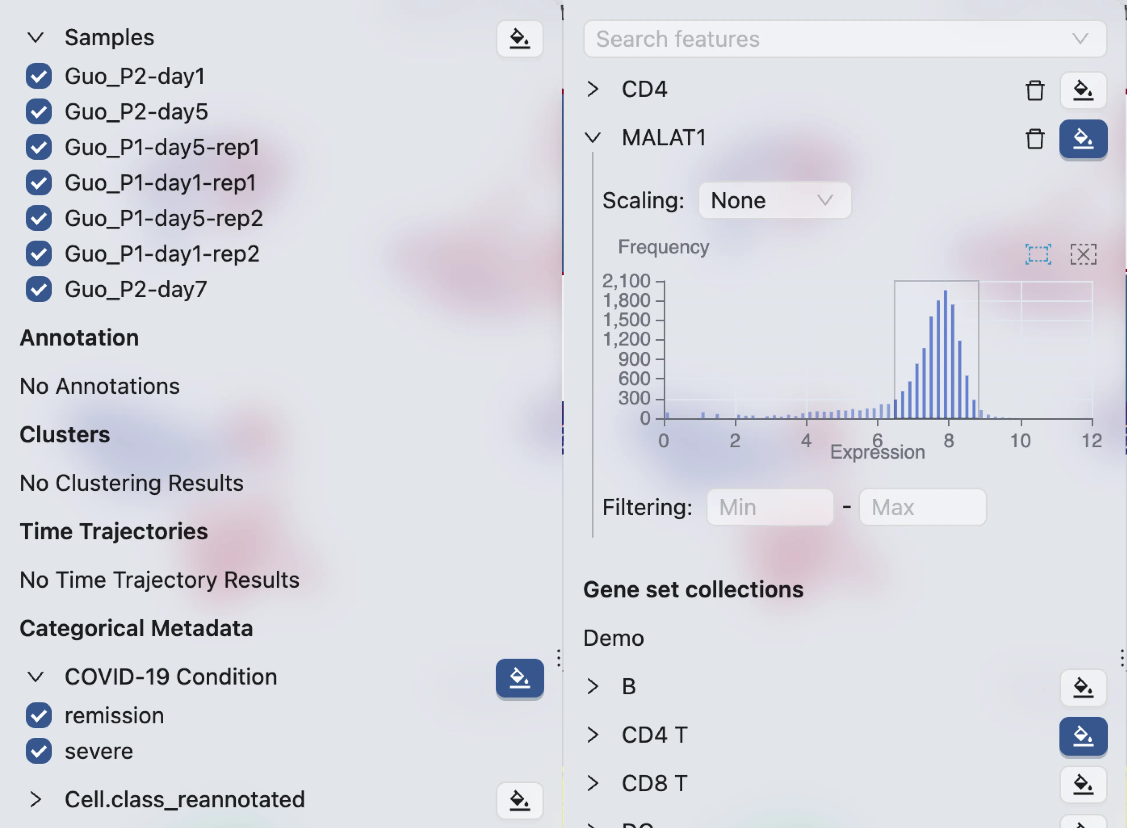 In the data filtering panel, you can filter cells based on different criteria, including the number of UMI counts, the number of genes expressed, and the percentage of mitochondrial genes.