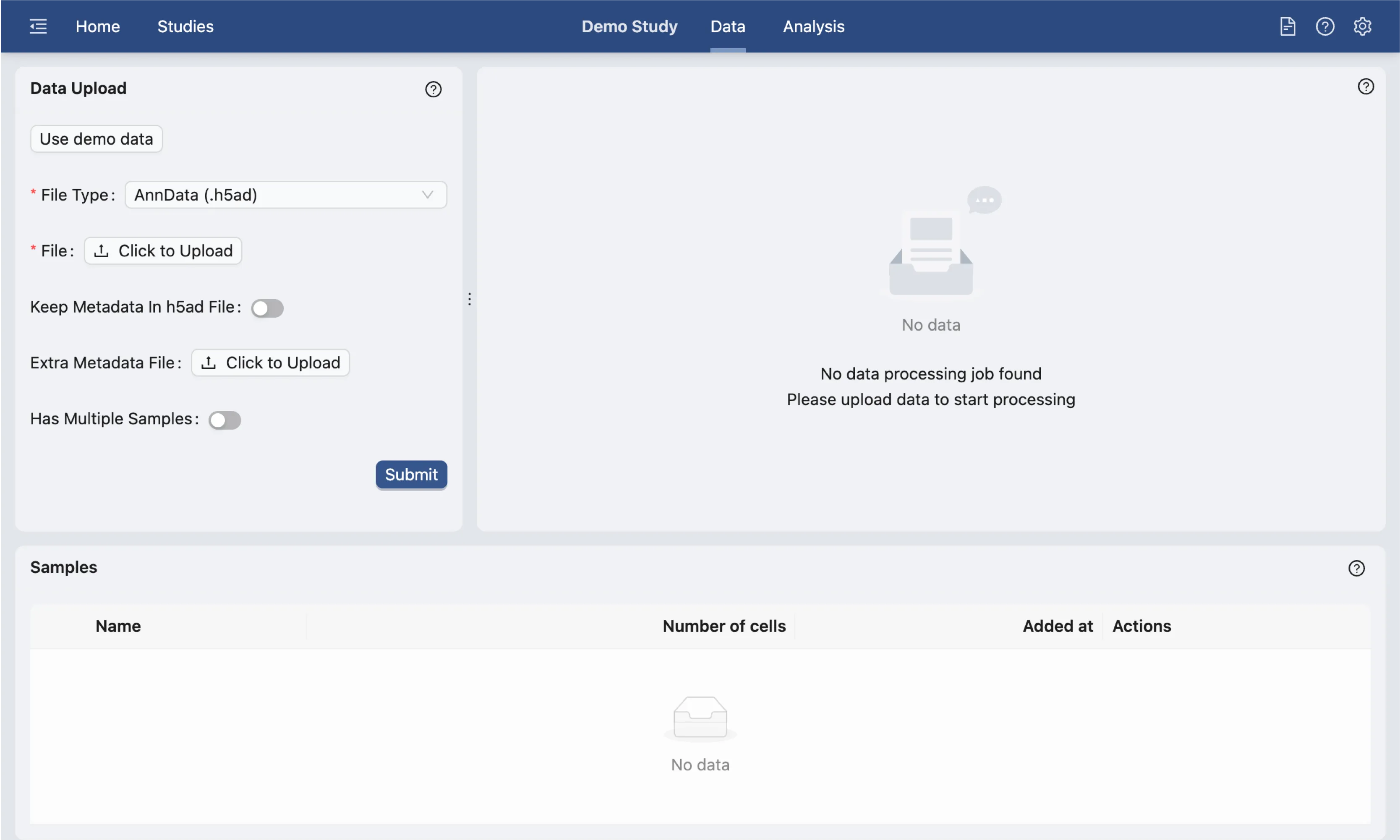 On the data management page, you can upload your data files. In this tutorial, we will use the demo dataset provided.