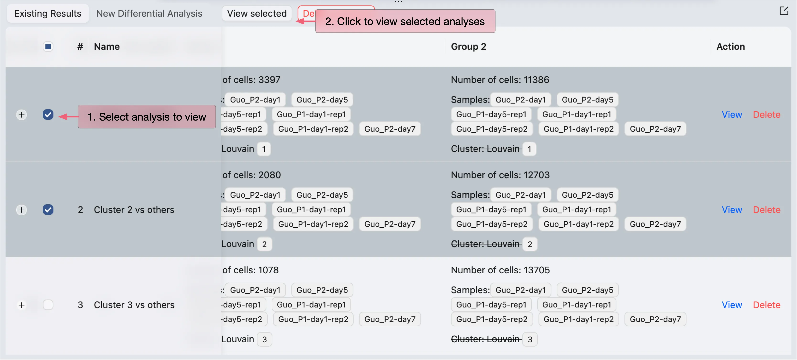 iSCANGuide allows you to view and visualize multiple DE results at once. To visualize the DE results, simply select the results you want to visualize in the table then click on the View selected button.