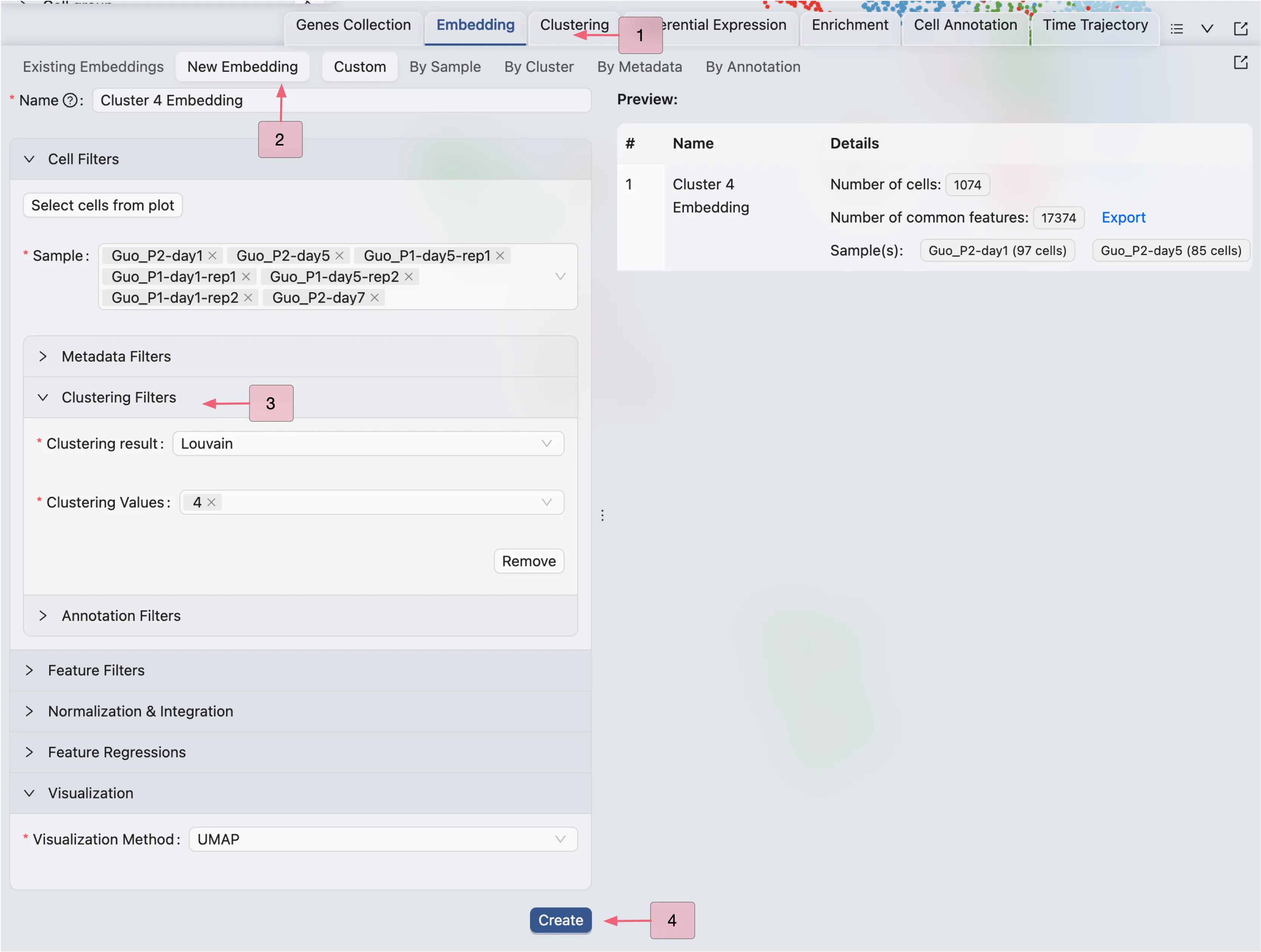 Cluster 4using Clustering Filters in the Cell Filtering panel.Leave the default settings for the embedding method and parameters.