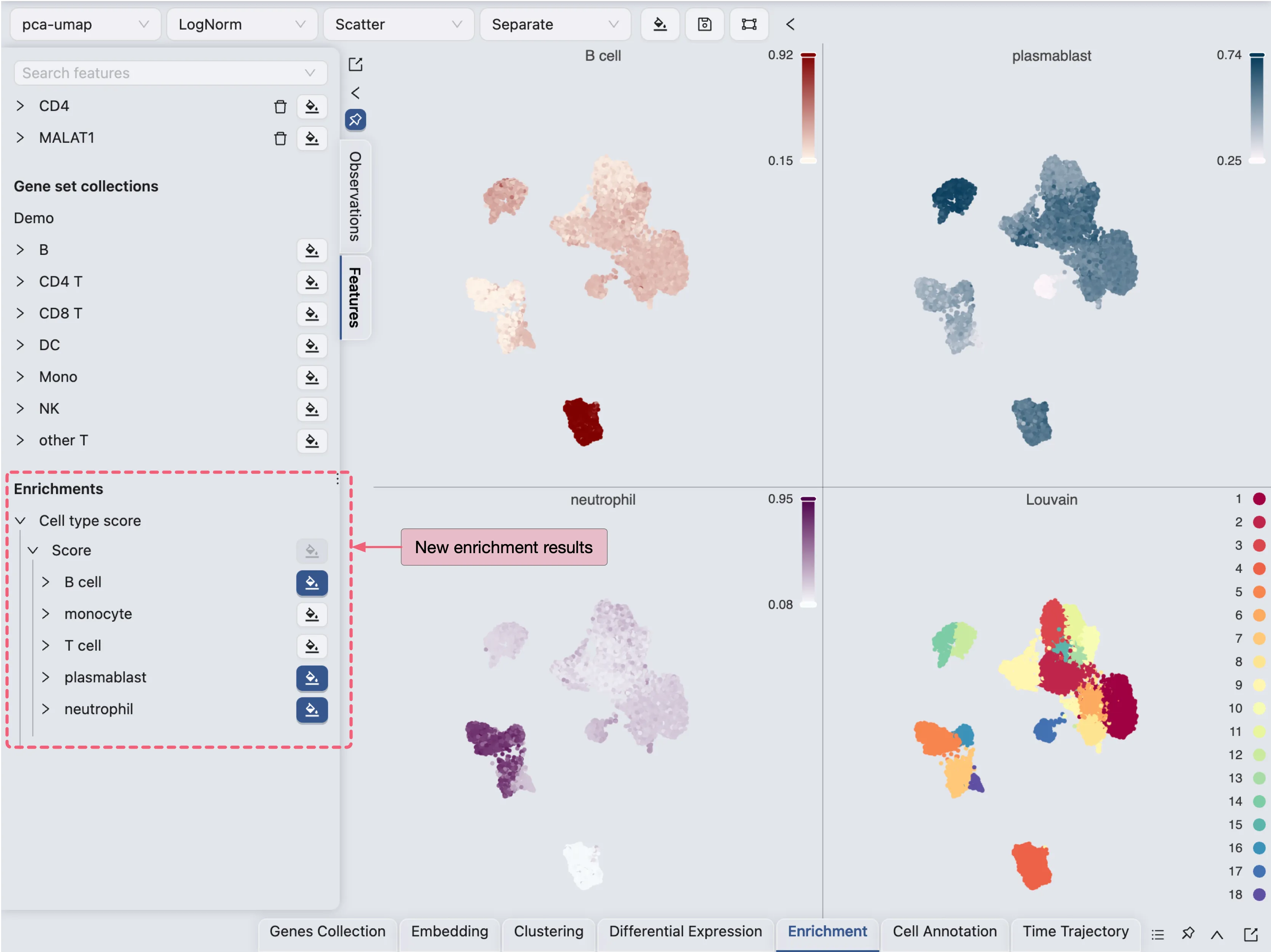 iSCANGuide provides multiple tools for enriching cells to help with cell annotation. You can enrich cells using genes from gene set collections, differentially expressed genes, or using pretrained models to calculate cell type scores.