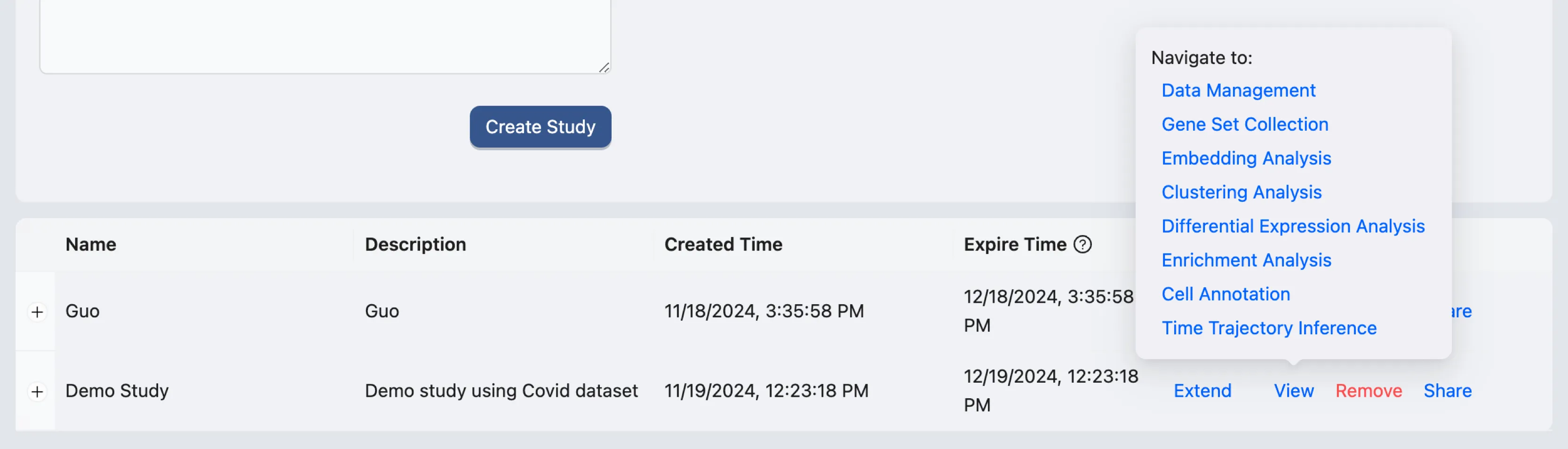 To create a new study, navigate to the Study Management page and fill in the required fields in the Create Study form.
