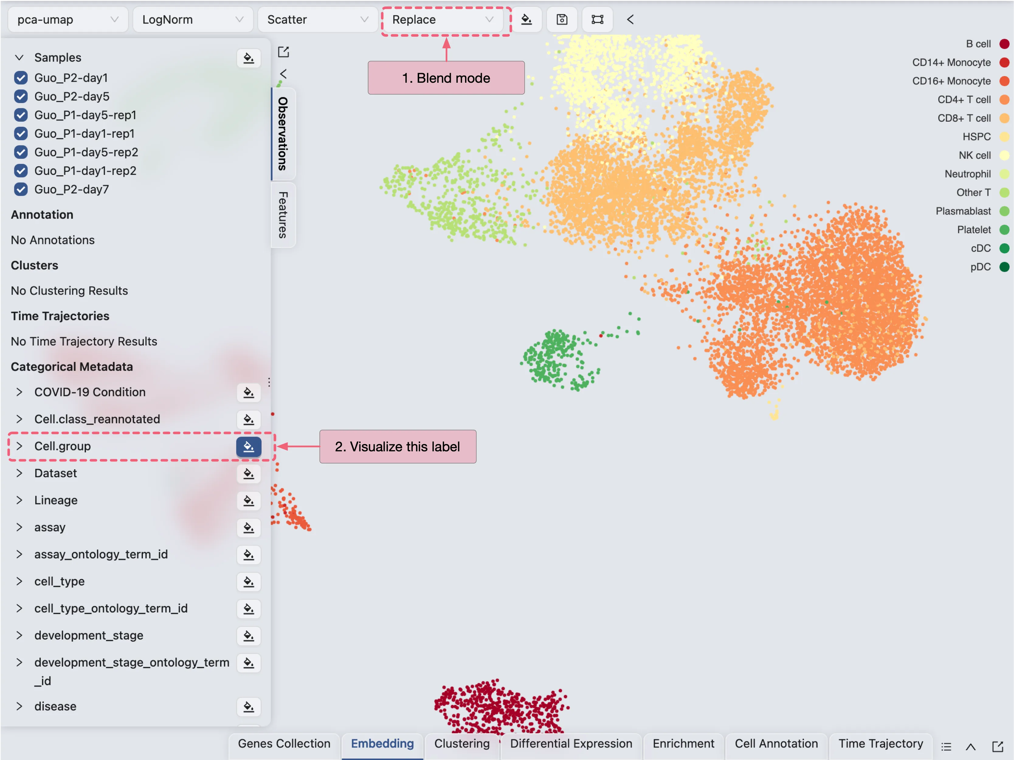 Top Toolbar: Contains dropdown menus for selecting embedding, data normalization, plot type, blending mode, and color map.