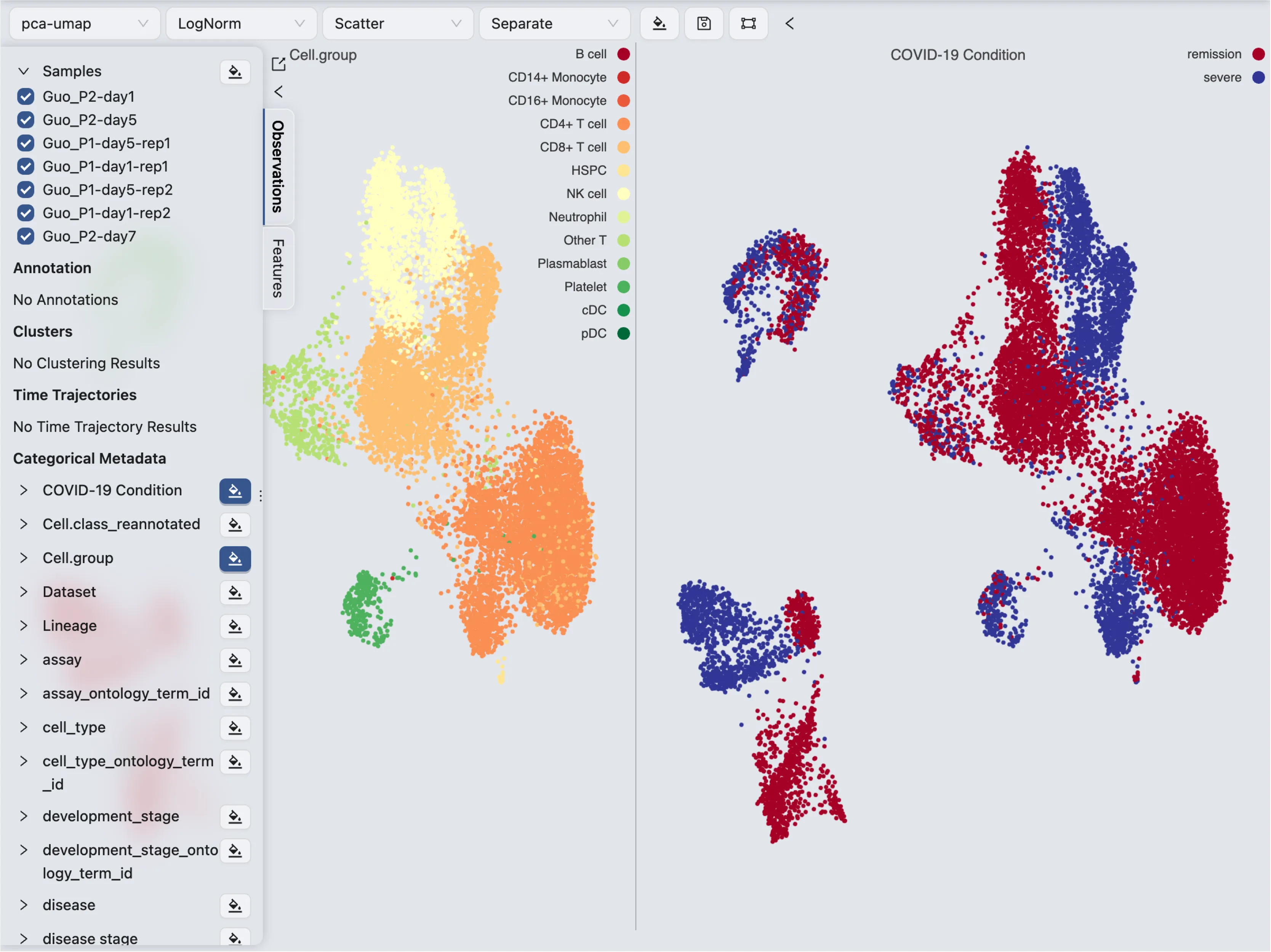 In the following example, we will compare gene expression between two conditions: Remission and Severe in the disease stage metadata. However, instead of comparing two big groups of cells, we will compare within the new annotation label we created.