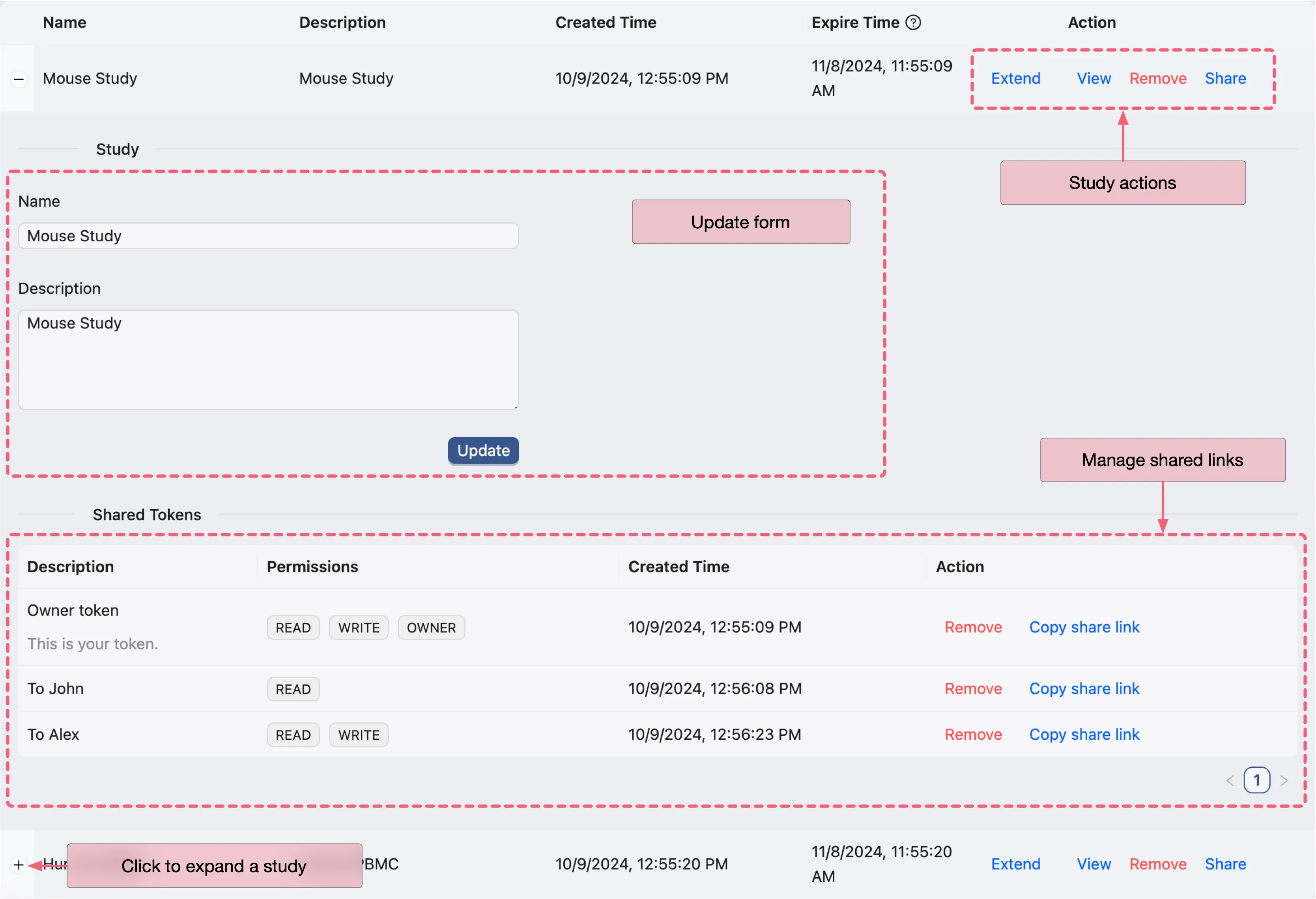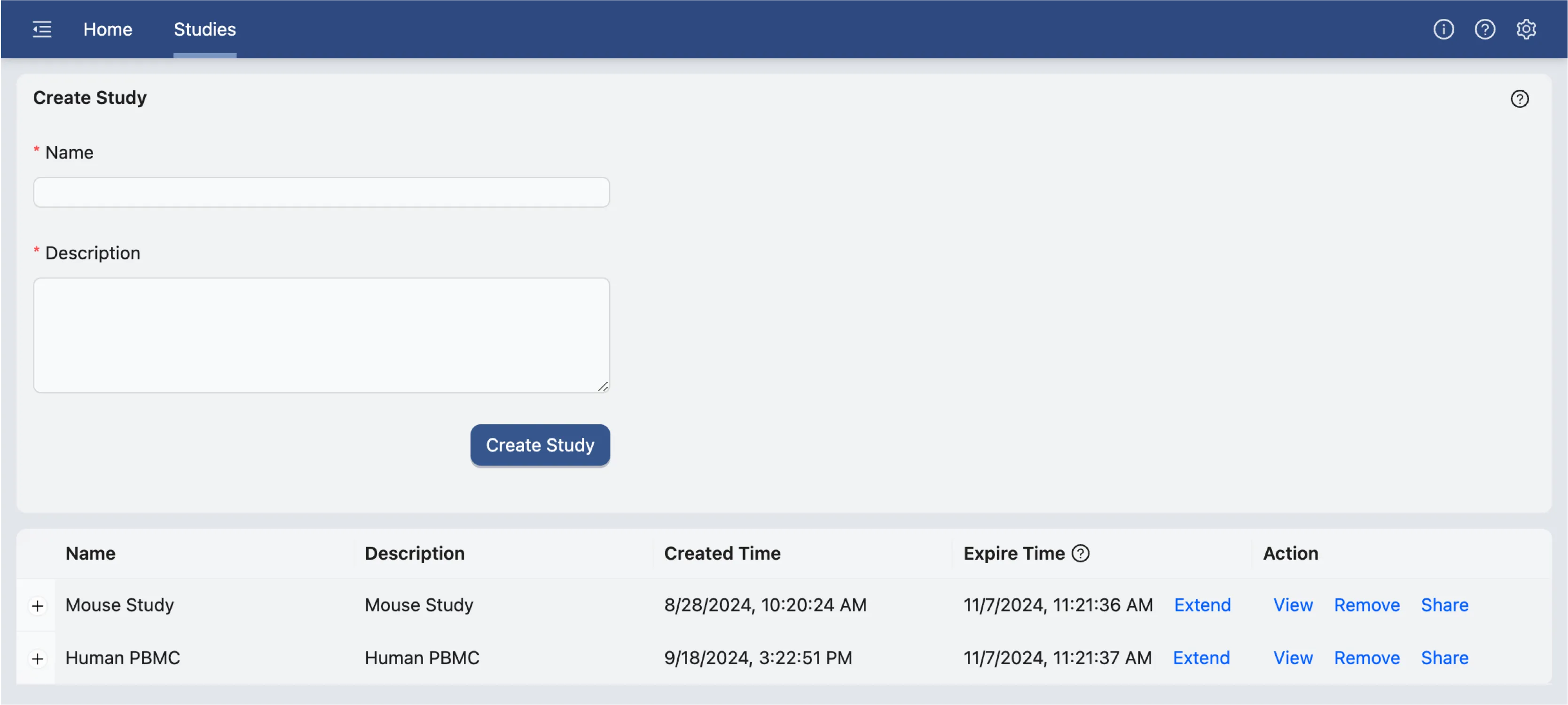 Viewbutton: Access the study dashboard for data analysisRemovebutton: Permanently delete the study and associated dataSharebutton: Collaborate with colleagues by sharing the study. See details below.Extendbutton: Extend the study's expiration date. See details below.+icon: Expand study details to:Update study name and description using the update form