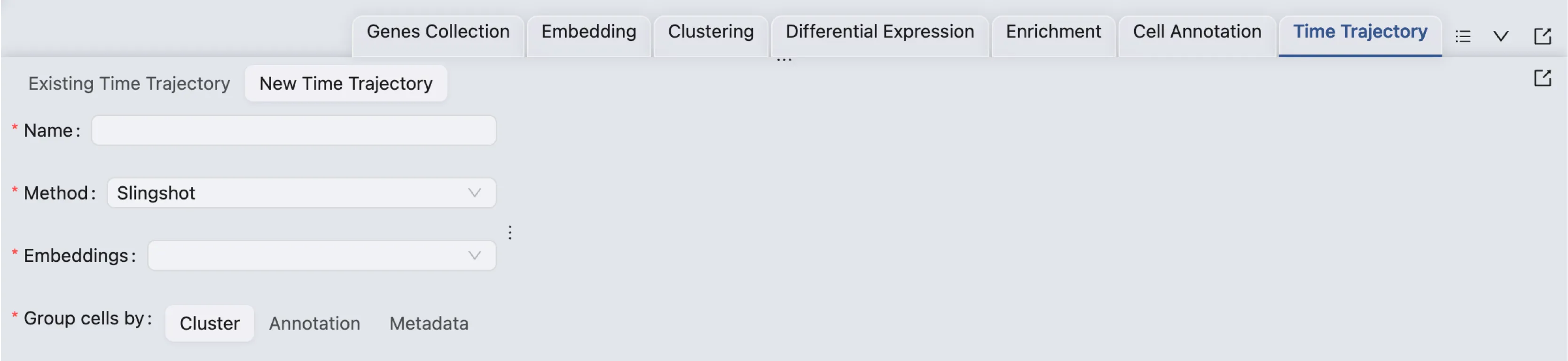 To create a new pseudotime trajectory inference, click on the New Time Trajectory button. A form will appear where you can enter the name for the pseudotime, select the method, embedding, and how to group cells.