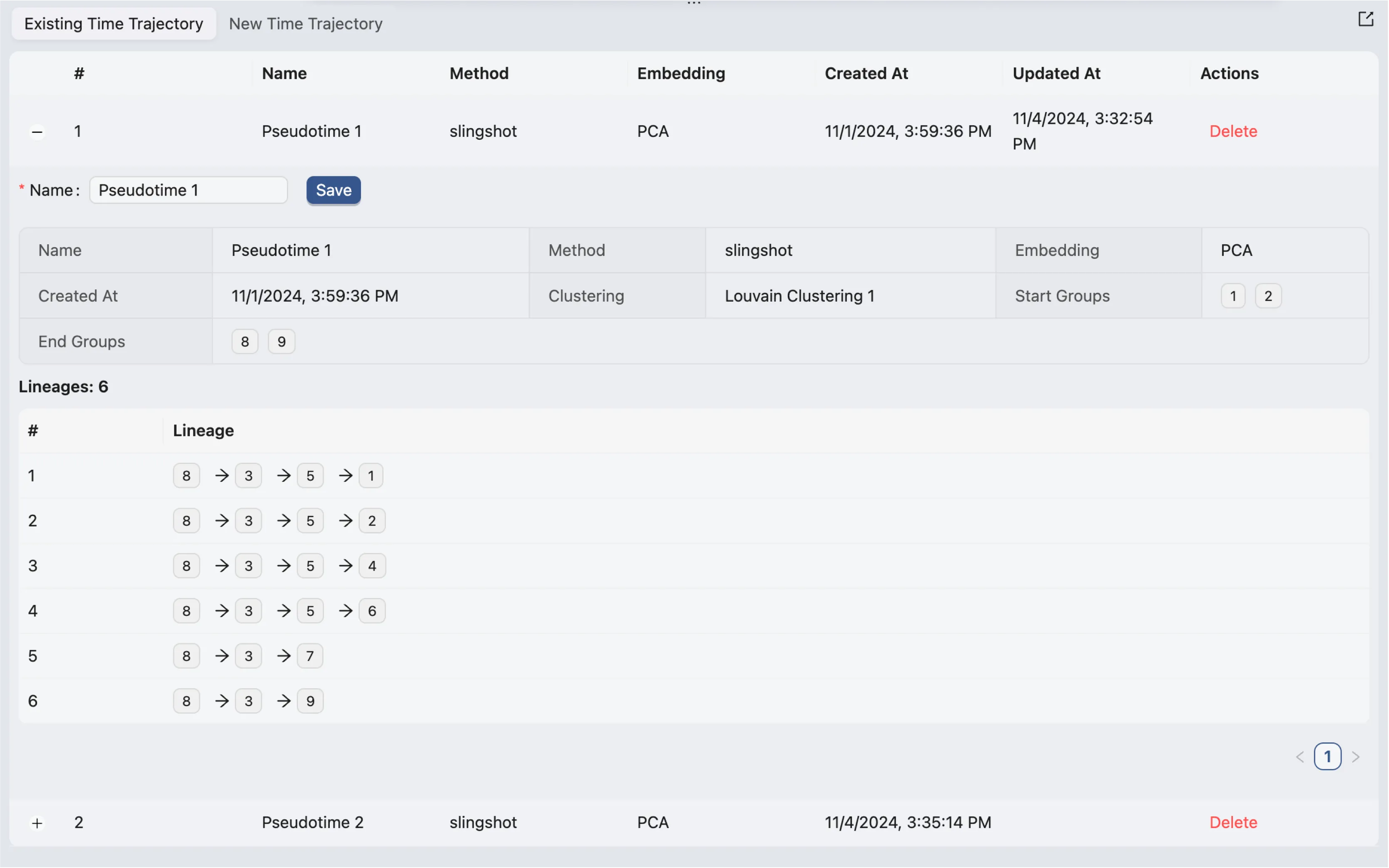 After running pseudotime trajectory inference, you can view the results in the Existing Time Trajectory table.