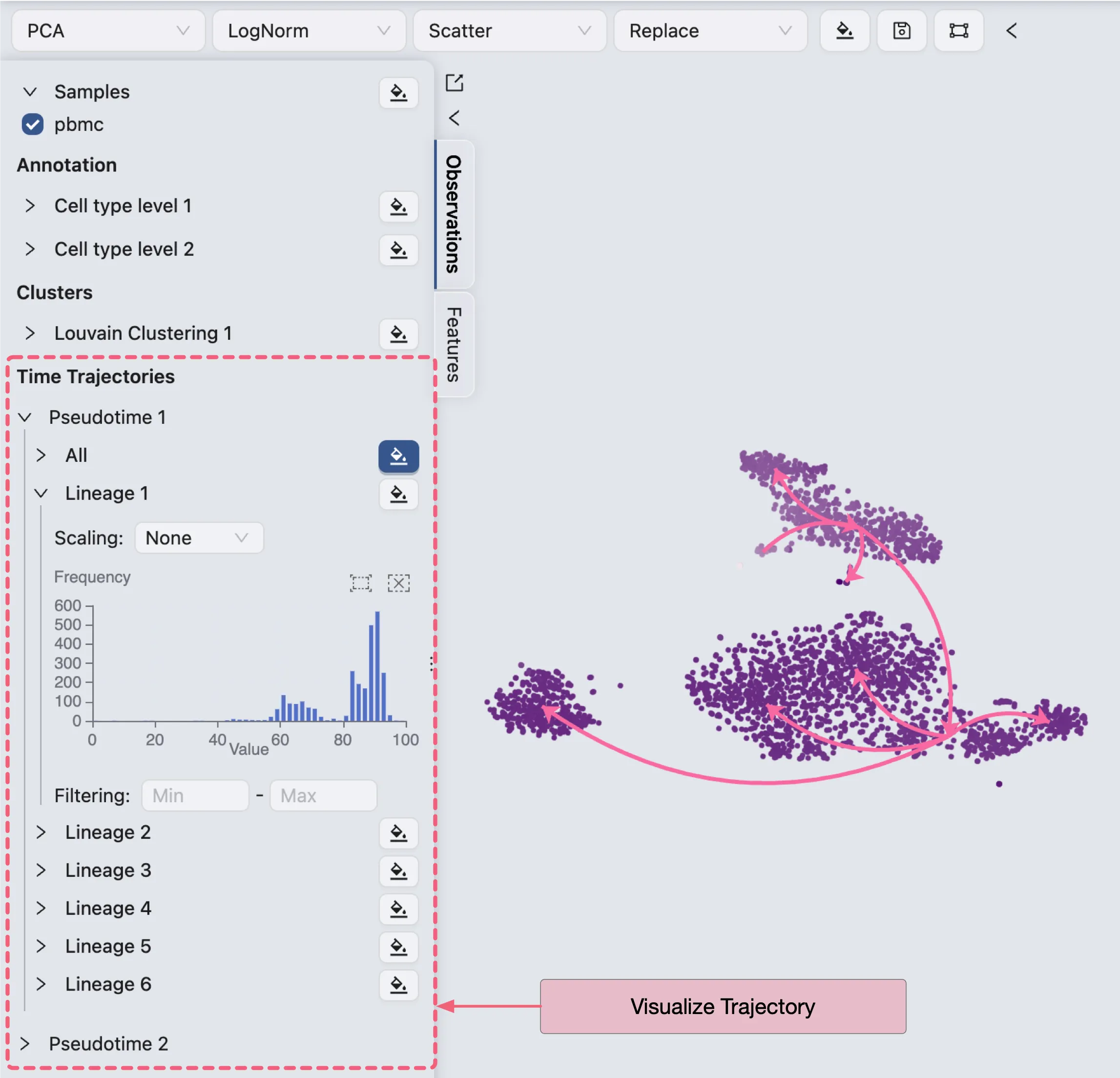 Once you have created an existing pseudotime trajectory inference, the options for visualizing the pseudotime trajectory will be available on the Left Panel.